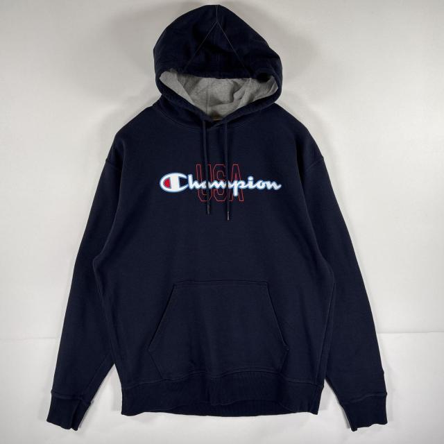 古着 チャンピオン Champion パーカー スウェット ビッグロゴプリント プルオーバー フーディ L ネイビー メンズ