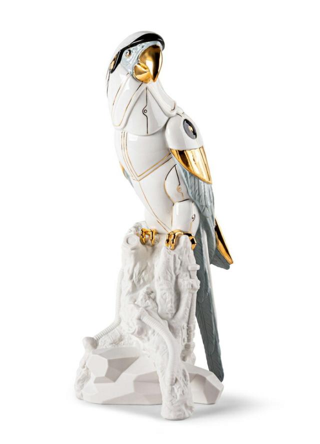 ロボットのような外見を持つコンゴウインコをポーセリンで表現した作品
