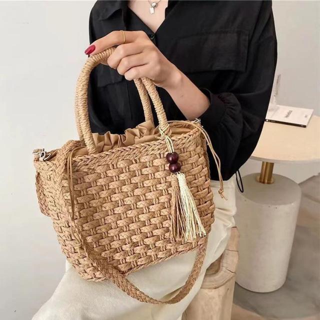 かごバッグ ショルダー 斜めがけ 手提げ 両用 透かし編み 浴衣バッグ 普段 内袋付き 巾着式 パール フリンジ ハンドバッグ レディース