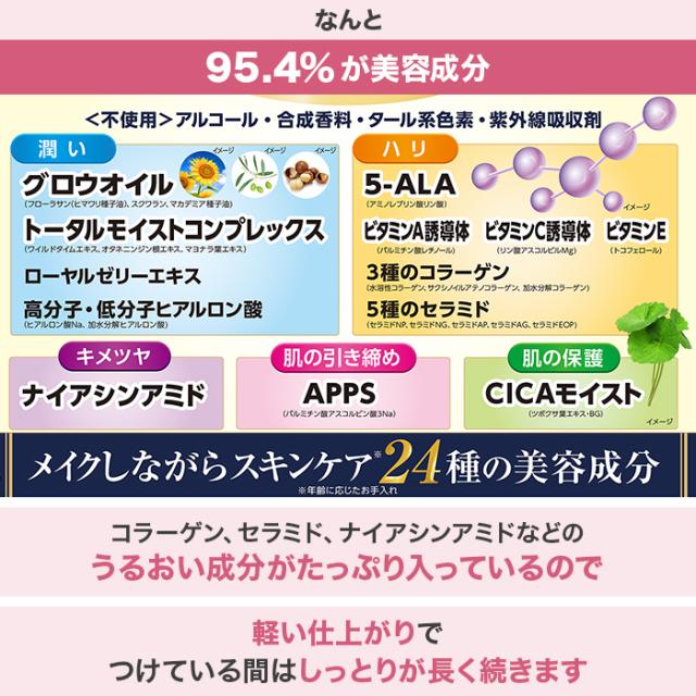 ヒマワリ種子油、オタネニンジン根エキス、マヨラナ葉エキス、ワイルドタイムエキス、ローヤルセリーエキス、マカデミア種子油、ステアリン酸、イソステアリン酸、ジステアルジモニウムヘクトライト、フェノキシエタノール、オクチルドデカノール、クエン酸Na、トリイソステアリン酸ポリグリセリル-2、炭酸Ca、メタクリル酸メチルクロスポリマー、(ジメチコン/ビニルジメチコン)クロスポリマー、グリチルリチン酸2K、シリカ、トコフェロール、スクワラン、パルミチン酸アスコルビルリン酸3Na、リン酸アスコルビルMg、加水分解ヒアルロン酸、水添レシチン、フィトステロールズ、パルミチン酸レチノール、セラミドNG、セラミドAP、セラミドAG、セラミドNP、ヒアルロン酸Na、加水分解コラーゲン、サクシノイルアテロコラーゲン、リン酸2Na、リン酸K、水溶性コラーゲン、セラミドEOP、酸化チタン、タルク、水酸化AI、酸化鉄