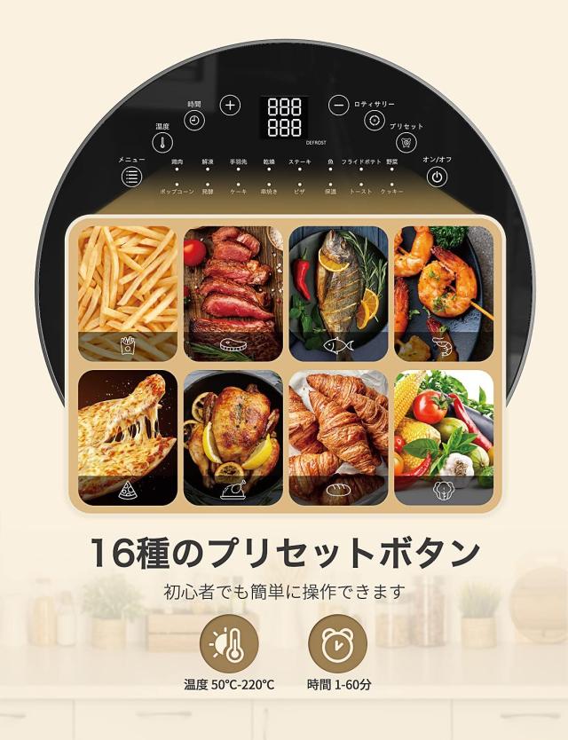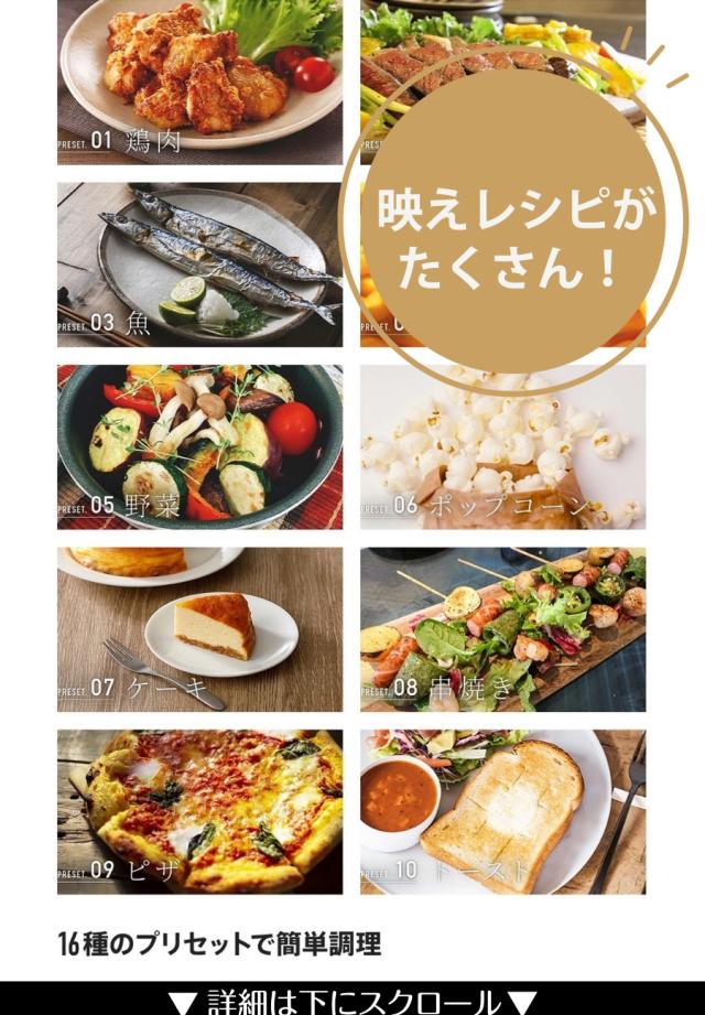 16種のプリセットで簡単調理。透明窓付きで焼き加減も一目瞭然。公式サイトに電子レシピも◎