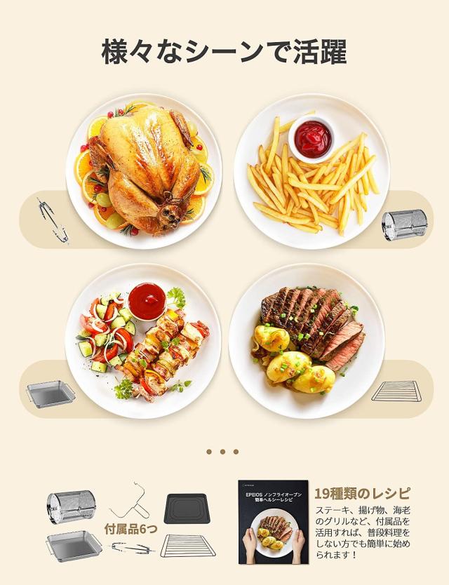 付属品:日本語説明書1部、保証カード1枚、19品目のレシピ1冊、アクセサリー6種(油・くず受け皿、ロティサリートング、ワイヤーラック、メッシュバスケット、回転バスケット)