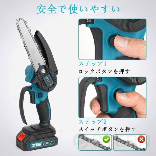 小型ちぇーんそーは安全的なロックボタンが付きなので、操作する時に2つのスイッチを同時に押す必要があり、誤操作を防止できます。
