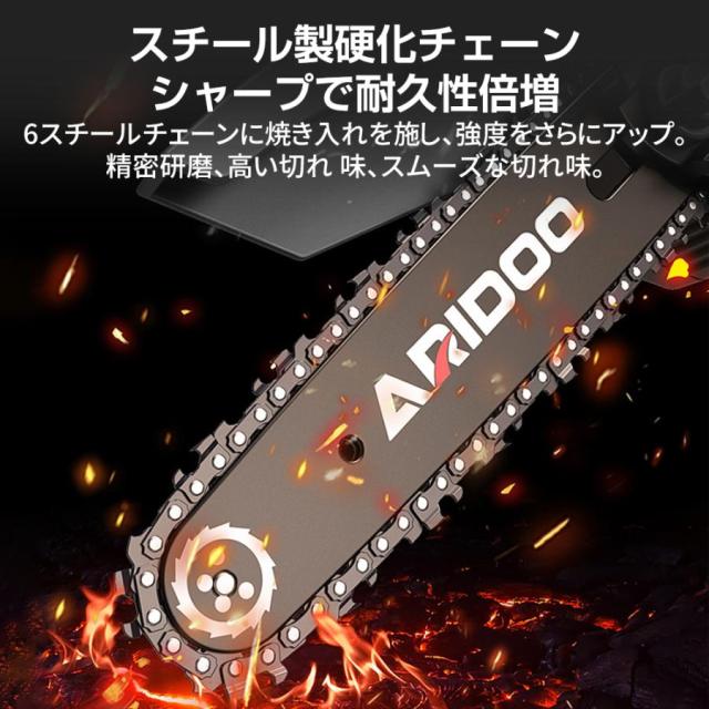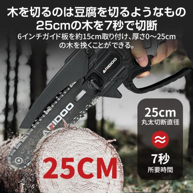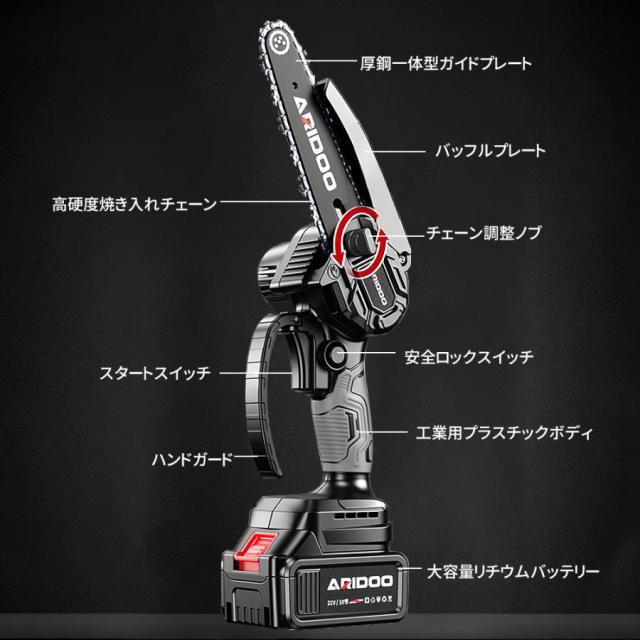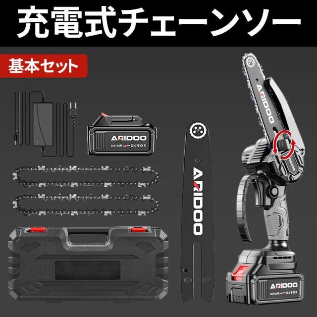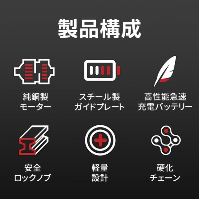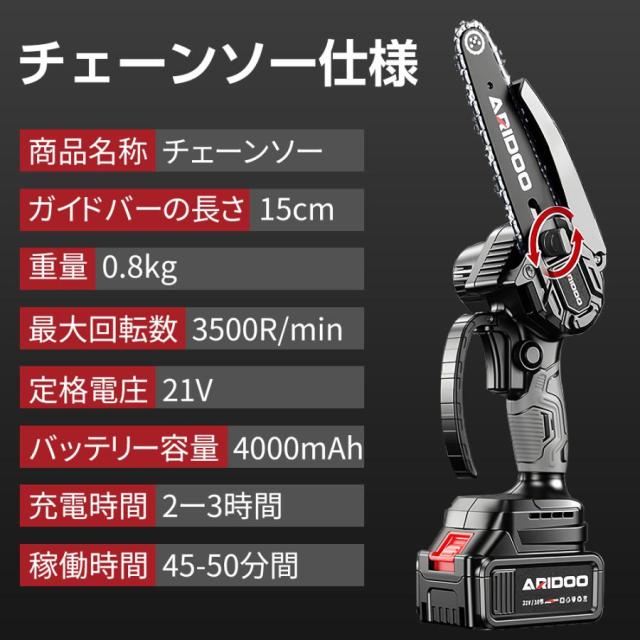 付属品:チェーンソー本体*1、バッテリー*2、充電器1*、収納箱*1、チェーン*2、ゴーグル*1、手袋*1