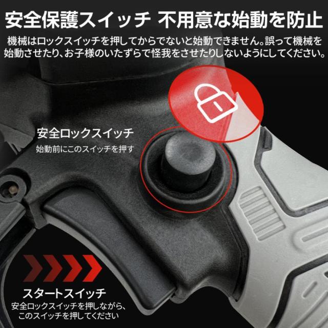[高い安全性】安全性を考慮して設計された小型チェーンソーは、トリガーから手を離すと自動的にチェンの回転が止まる機能が付いており、誤操作を防止するセーフティロック機能が付いているので、使用していないときは、セーフティスイッチを押している限り、小型チェーンソーの作動をロックすることができません(チェーンソーをスタートさせるには、ロックボタンを押してロックを解除する必要があります。 (チェーンソーをスタートするには、ロックボタンを押してロックを解除する必要があります。 同時に2つのボタンを押す必要がなく、非常に便利です)。