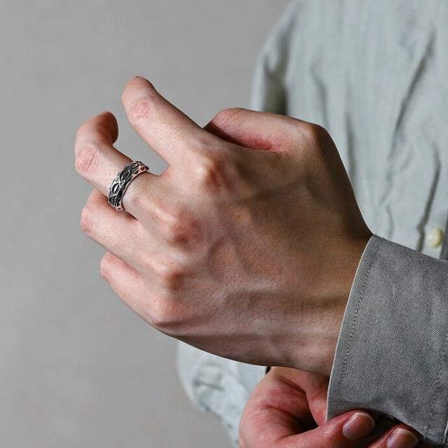 ネイティブ柄が彫金と燻し加工で力強くデザインされたリングです。直線と曲線の組み合わせによるドーム型フォルムは、ボリューム感とスッキリ感を両立できるまさに良いとこ取りのデザイン。内側は裏抜きが施されており見た目より軽い着け心地です。アメカジコーデにさらりと合わせたいリングです。