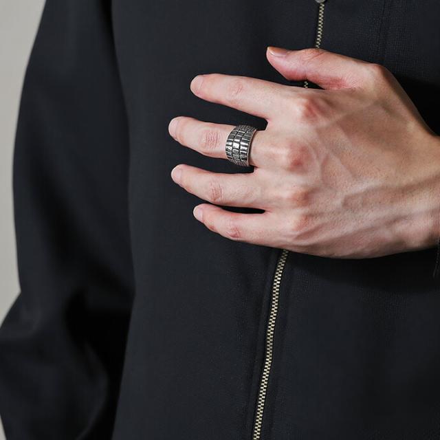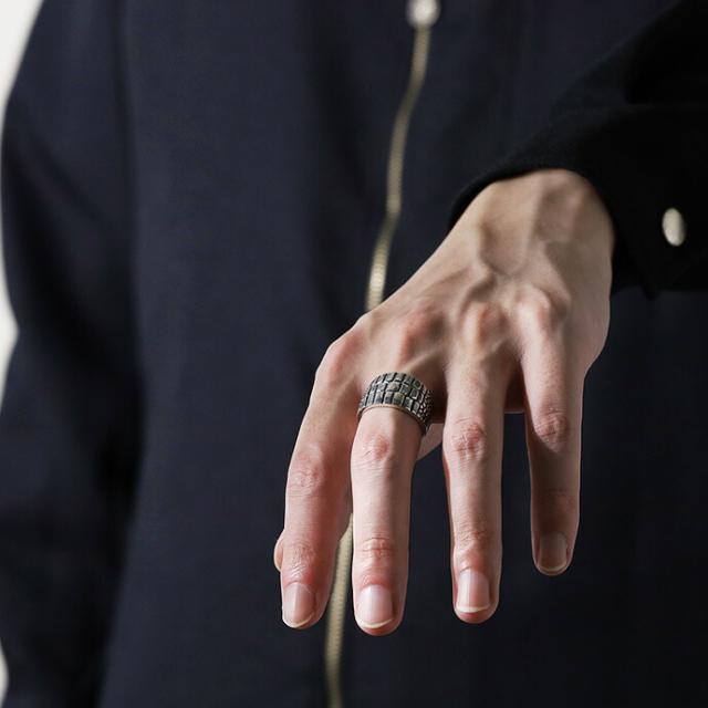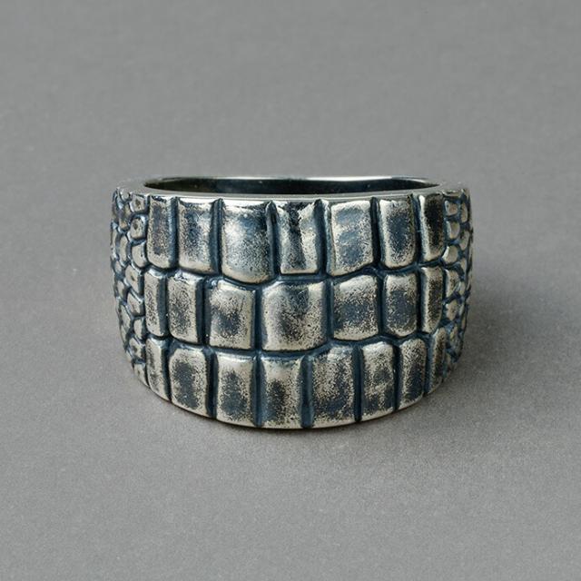 四角いウロコが特徴的なワニのお腹の革を燻し加工でワイルドに表現したリング。整然と並ぶ四角いウロコが美しいワニのお腹の革は「肚ワニ」と呼ばれ、ワニ革の中で最高級品とされる人気のレザーです。肚ワニの特徴である四角いウロコ(竹腑)だけでなく、丸いウロコ(丸腑)も再現しています。前面部分に裏抜きがされているのでボリュームがありながらも軽い着用感。着けるだけでコーデが決まるワイルドな個性派リングです。