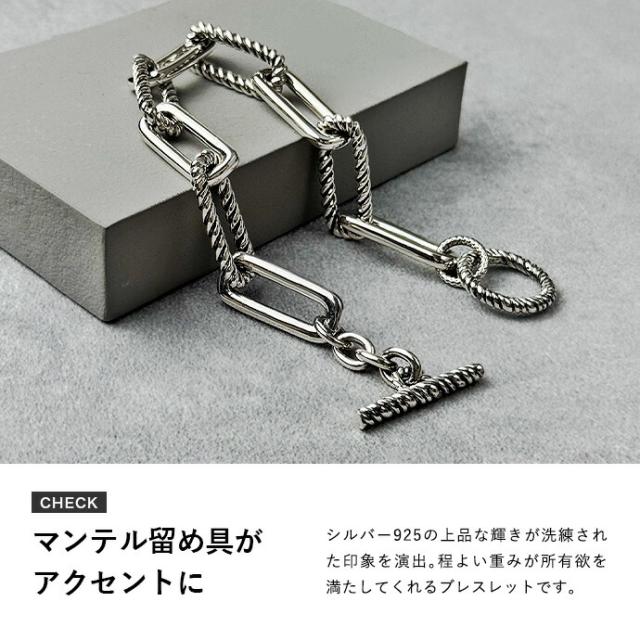 スタイリッシュなスクエアチェーンが印象的なマンテルブレスレット。ツイストデザインのコマとベーシックなデザインのコマが交互に連なった、シンプルでありながらも個性が際立つデザインです。留め具には人気のマンテル留め具を採用、モード感と着脱のしやすさが魅力です。シルバー925の上品な輝きが洗練された印象を演出。程よい重みが所有欲を満たしてくれるアイテムです。