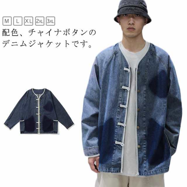 チャイナボタン メンズ 配色 ジャケット 大きいサイズ デニムジャケット カップル デニム ノーカラー チャイナボタン 切り替え アウター カジュアル 通学 カジュアルジャケット BF系 アウター レトロ M L XL 2XL