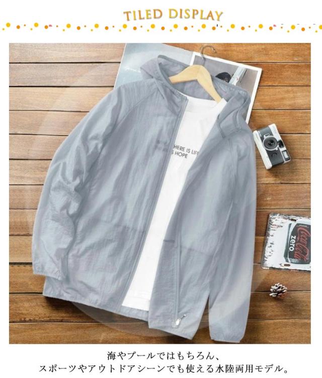 | 【薄手でしっかりUVカットできるパーカー!】 ■UPF50+■ 海やプールではもちろん、スポーツやアウトドアシーンでも使える水陸両用モデル。 速乾性に優れた素材で、汗や水を吸収していつでもサラサラの着心地。また、軽量・コンパクトでかばんの中にも入れとけて、持ち運びもラクラク! シンプルなカラーだから幅広い方にオススメ! 通勤通学の時も日焼け止め用服としてtシャツの上に羽織るのもいいですし、寒すぎる冷房の中に必須のアウターとしても便利です。 | |