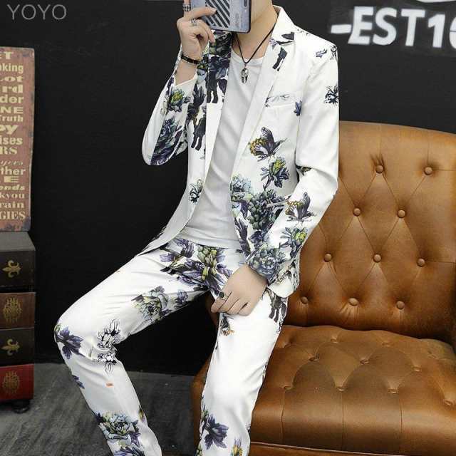カジュアルスーツメンズセットアップサマースーツおしゃれサマージャケットテーラード長袖スキニーパンツ上下紳士服派手花柄成人式