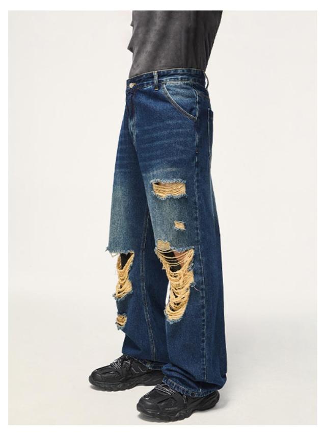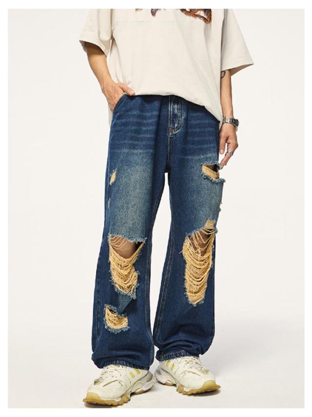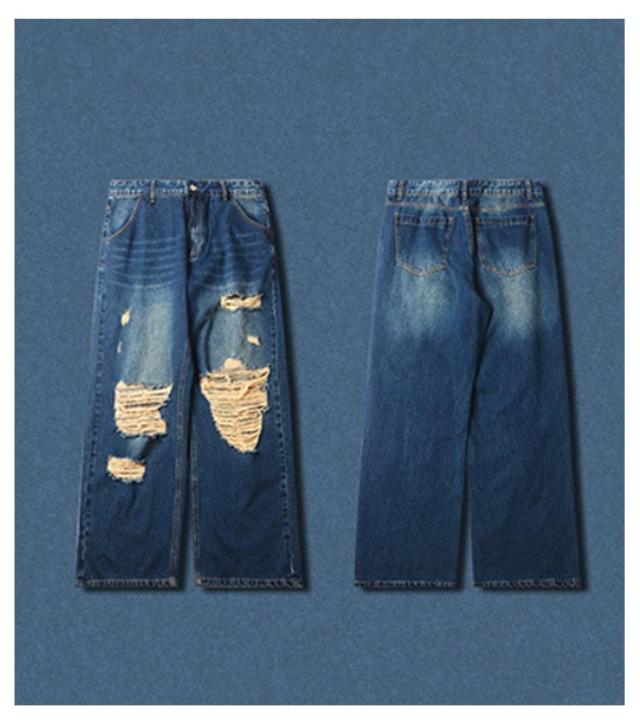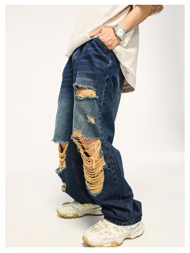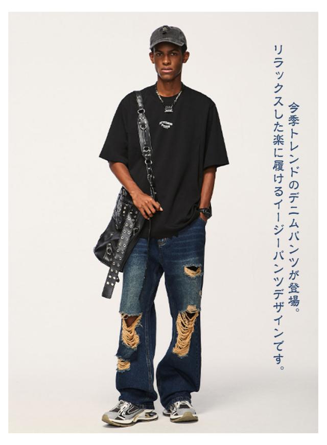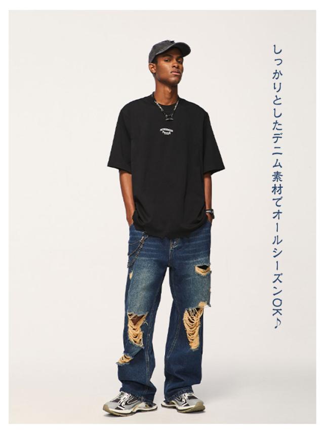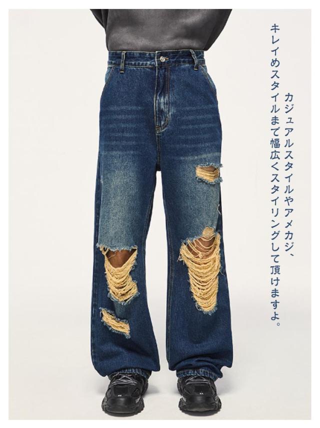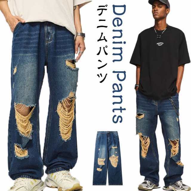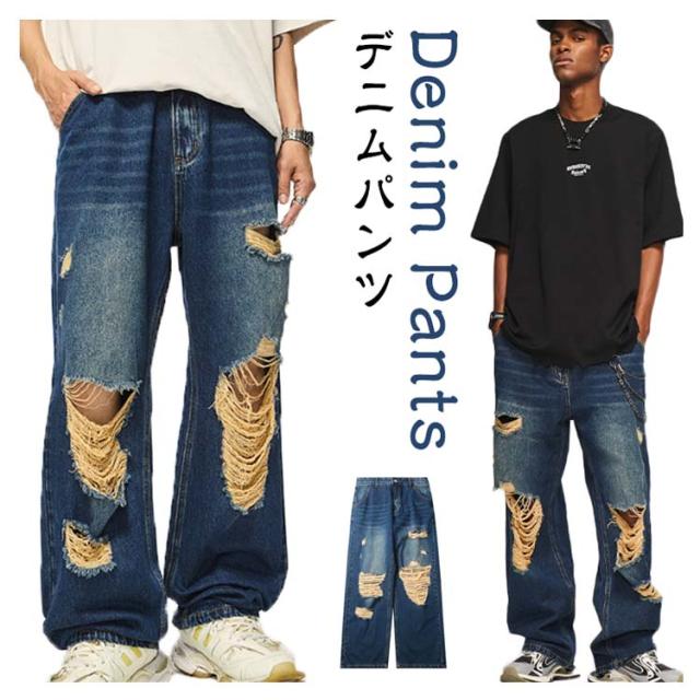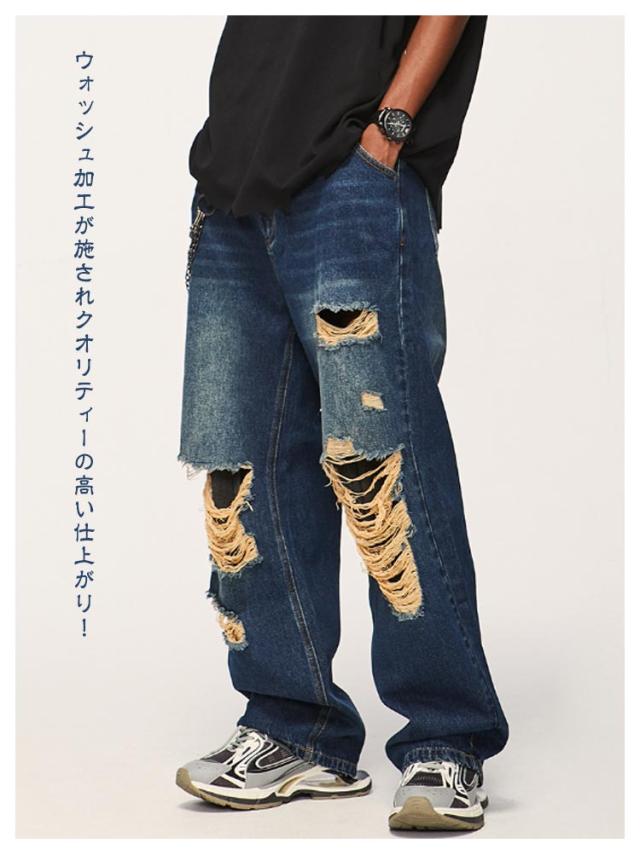 デニム ワイドパンツ ロング パンツ ダメージ加工 ストレート ワイド デニムパンツ メンズ ジーンズ デニム ストレートパンツ ストレート ジーンズ ウォッシュ デニムパンツ ゆったり イージーパンツ リラックス パンツ ストリート系 ダンス衣装 春 秋 冬 送料無料