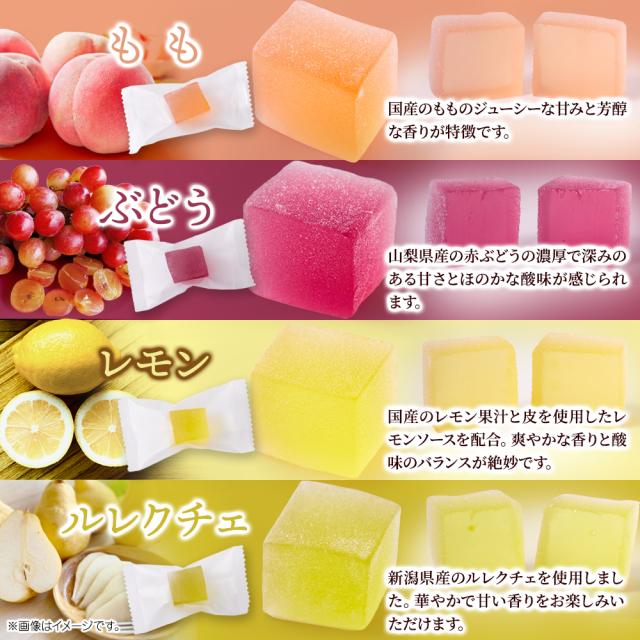 【4種の国産果汁♪】●もも●国産のもものジューシーな甘みと芳醇な香りが特徴。●ぶどう●山梨県産の赤ぶどうの濃厚で深みのある甘さとほのかな酸味が特徴。●レモン●国産のレモン果汁と皮を使用したレモンソースを配合。爽やかな香りと酸味のバランスが絶妙です。●ルレクチェ(洋梨)●新潟県産のルレクチェを使用。華やかで甘い香りをお楽しみいただけます。