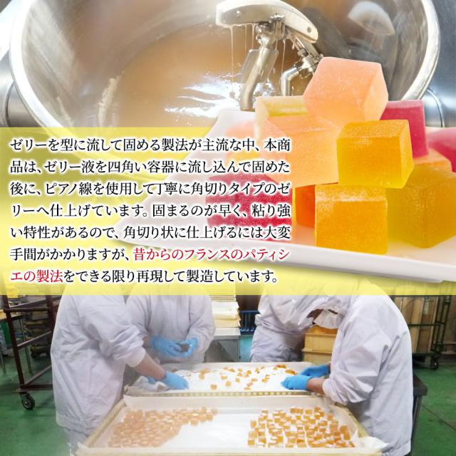 【美味しさのひみつ】ゼリーを型に流して固める製法が主流な中、ゼリー液を四角い容器に流し込んで固めた後に、ピアノ線を使用して丁寧に角切りタイプのゼリーへ仕上げています。固まるのが早く、粘り強い特性があるので、仕上げるには大変手間がかかりますが、昔からのフランスのパティシエの製法をできる限り再現して製造しています。