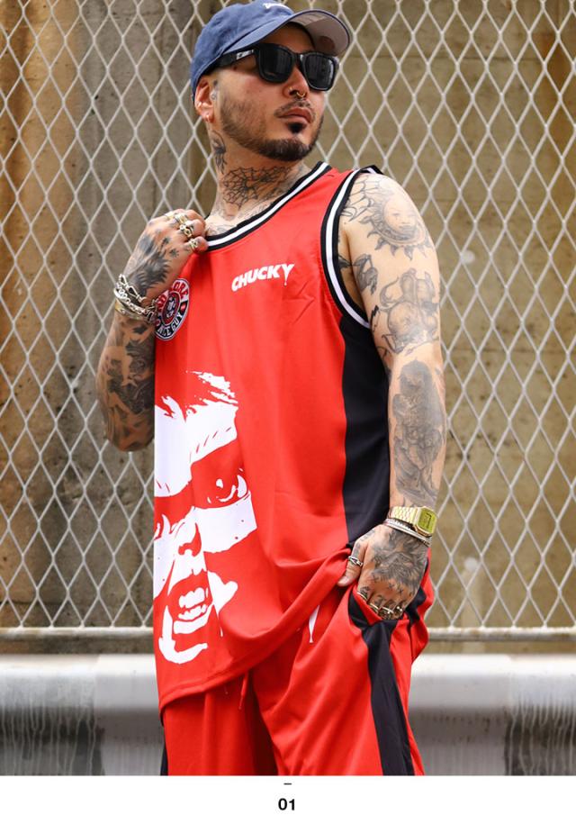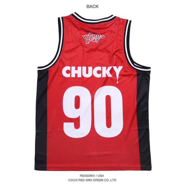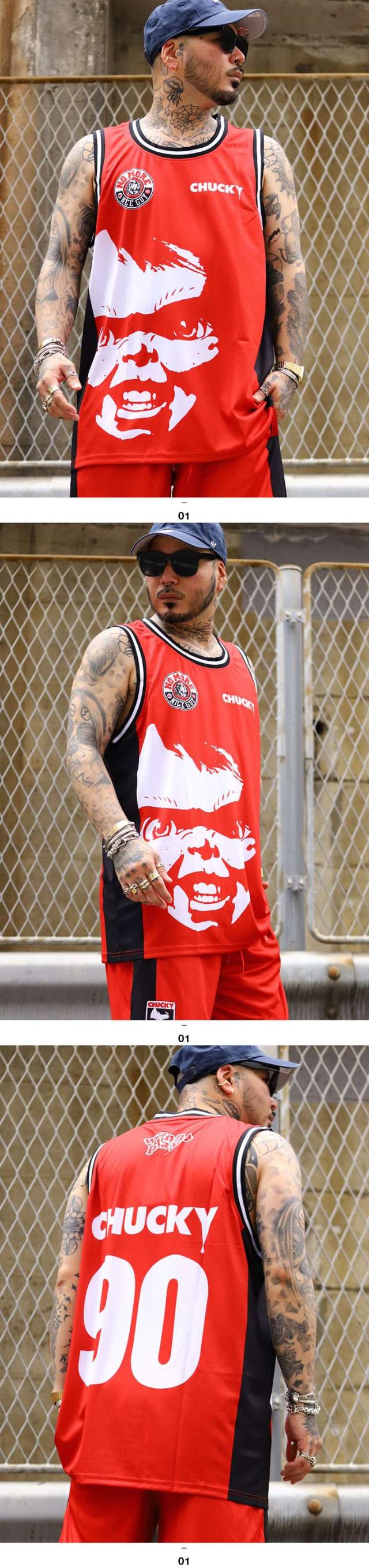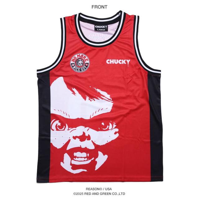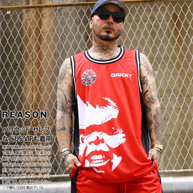 REASON × Chucky ノースリーブ メンズ 赤 大きいサイズ チャッキー Childs Play チャイルド・プレイ コラボ 公式 リーズン バスケットシャツ バスケシャツ タンクトップ ビッグシルエット ヒップホップ ファッション ストリート系 服 2025夏 新作 RR5051