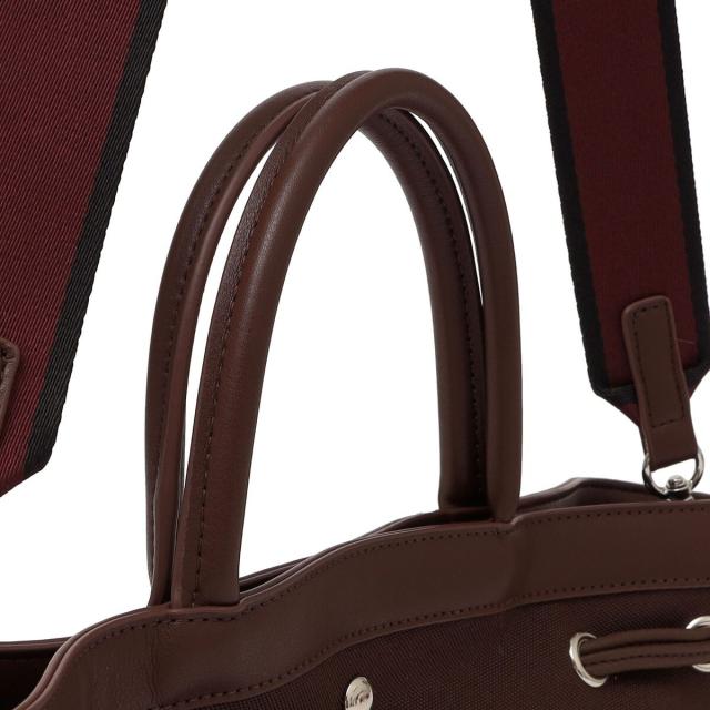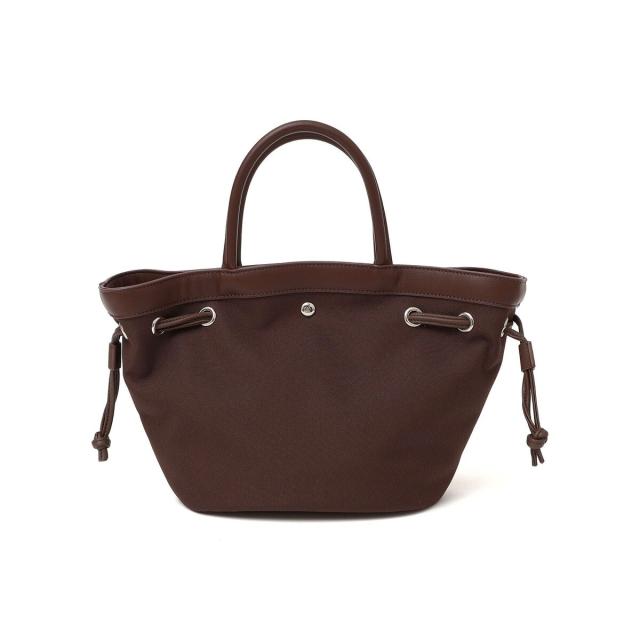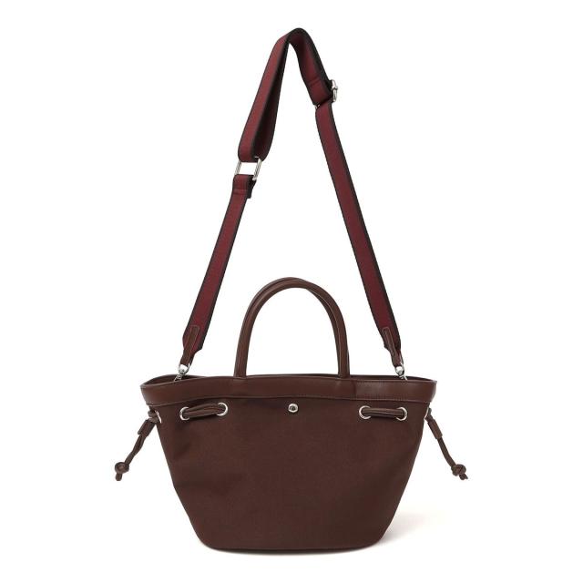 キャンバス見えのポリエステル素材と合皮のドロストデザインが新しいトートバッグです。
