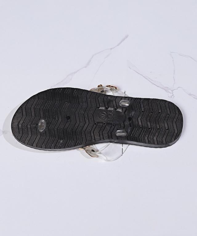 キラキラとしたビジューがあしらわれた、華やかなデザインのレディーストングサンダル