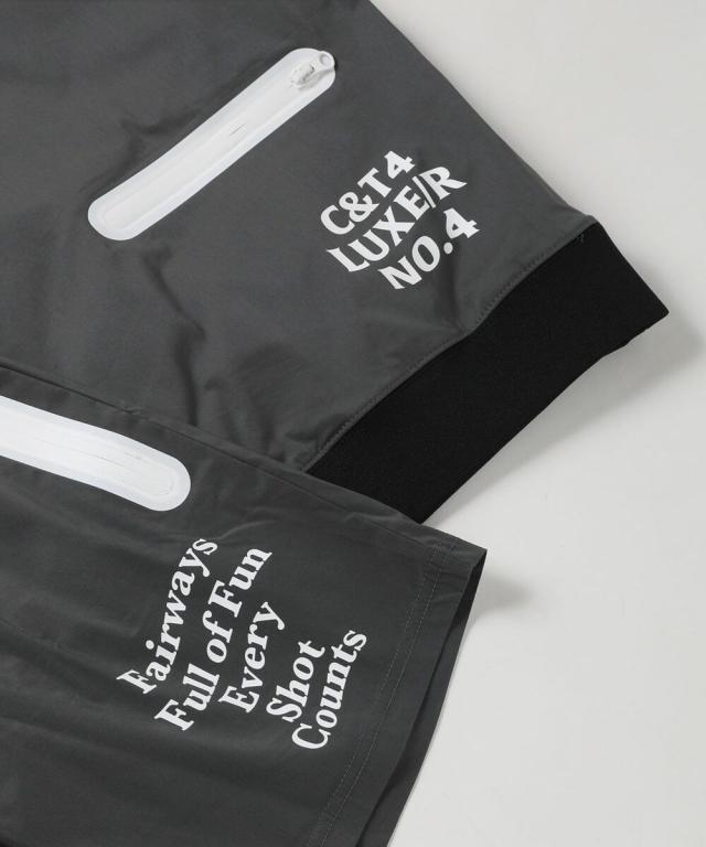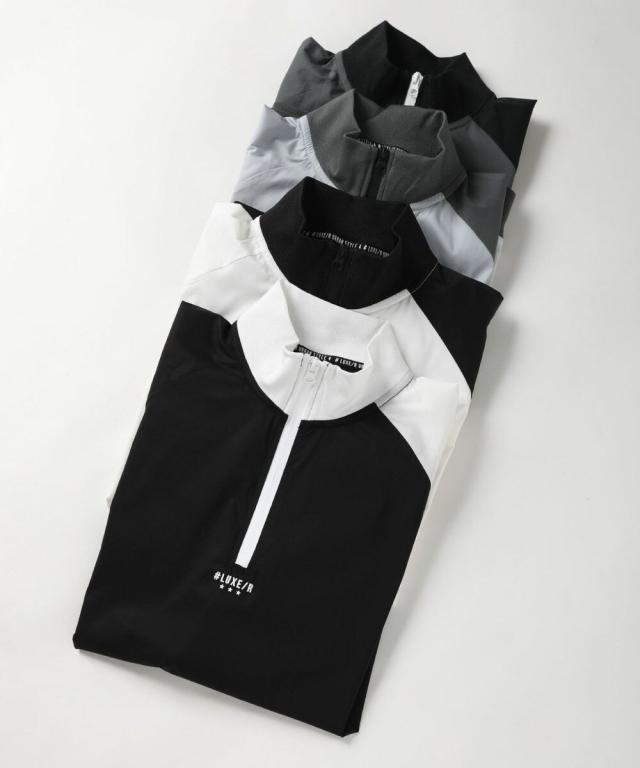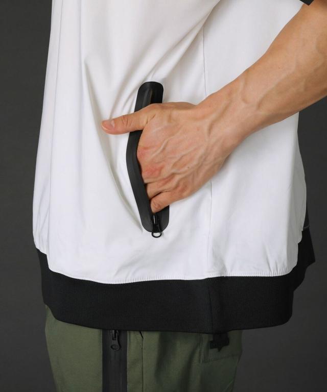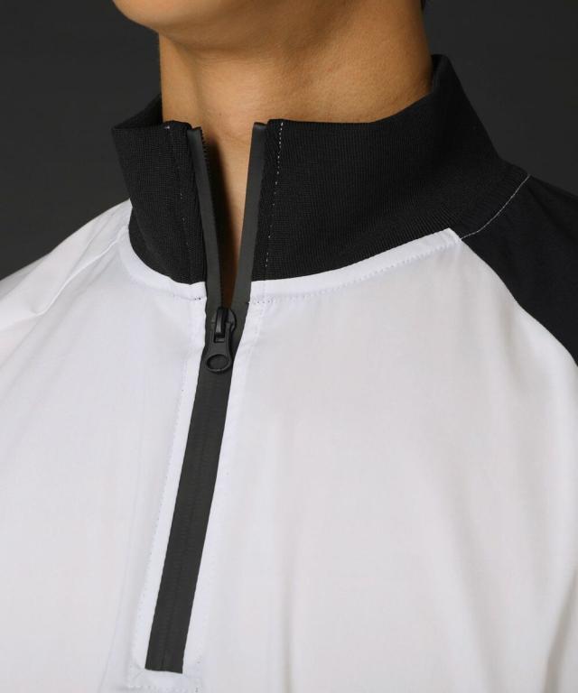 肩回りが動かしやすいラグランスリーブ、身幅にゆとりがあるサイジングでとても動きやすいのが特長。ジップを閉じた状態のハイネックスタイルであればゴルフ場でのドレスコードにも適しており、柔らかなリブ仕様なので優しいフィット感です。両サイドと右後ろには止水ジップポケットを配し、ゴルフやテニスなどのゲーム中にボールの収納が可能になっています。