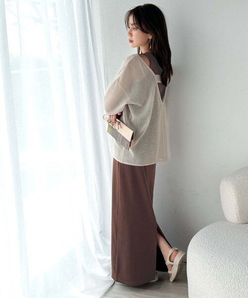 このメッシュトップスは、細かく編み込まれた高見え素材が魅力。ほどよく透け感がありつつ、肌が見えすぎない絶妙なデザインです◎
