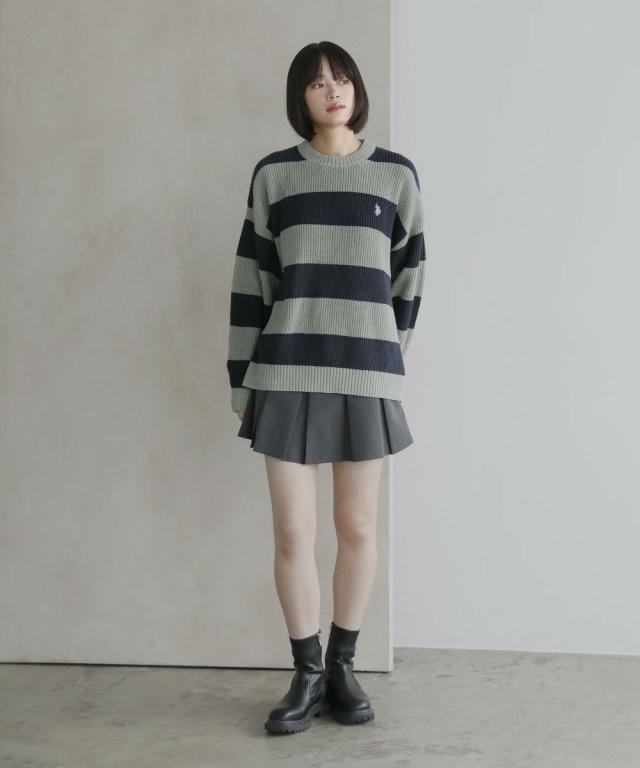 ざっくりとした畦編み素材のボーダーニット。太めのボーダーと、ローゲージの畦編み素材の雰囲気が抜け感のあるスタイルを創ります。ゆとりのあるオーバーサイズシルエットにドロップショルダーがリラックスした雰囲気。フロントのブランドロゴ刺繍がさりげないアクセントになります。落ち着いたトーンのボーダーで、コーディネートにも気軽に取り入れやすい一着。秋冬のスタイリングにラフな抜け感をプラスする、着回し力抜群のアイテムです。