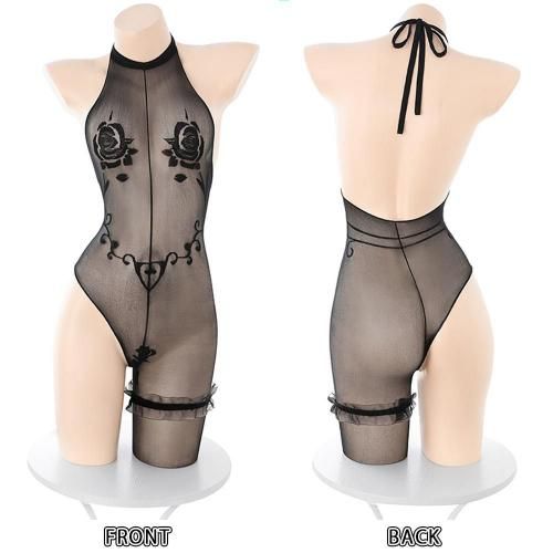 ストッキング レッグウェア タイツ パンスト アシンメトリー クロッチ ハイレグ ボディライン ホルターネック リボン 薔薇 ブラック グレー フリーサイズ