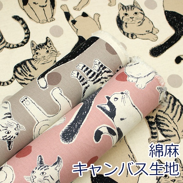 【10cm単位価格】ビッグネコ 猫 ねこ ドット 水玉 綿麻キャンバス 綿85% 麻15% 生地 布 約110cm幅 コットンこばやし KTS7110 ゆうパケット2m対応 ( ハンドメイド 手作り バッグ おしゃれ 手芸 入園 入学 巾着 雑貨小物 日本製 )