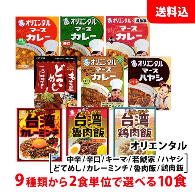 送料無料 オリエンタル お試しセット 10食 ≪ 中辛 辛口 キーマ 若鯱家 ハヤシ どてめし カレーミンチ 魯肉飯 鶏肉飯 ≫ 9種類から2食単位で選べる レトルト