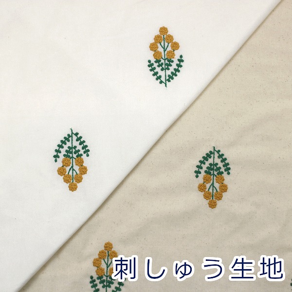 かわいいミモザ柄の刺しゅうが入った綿シーチング生地。