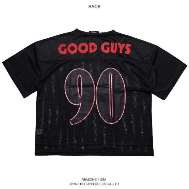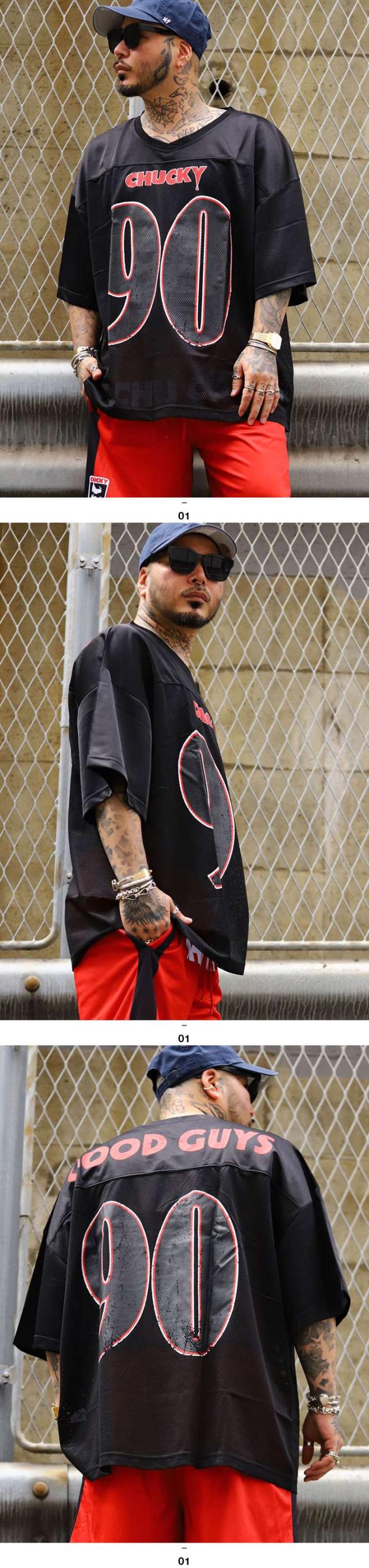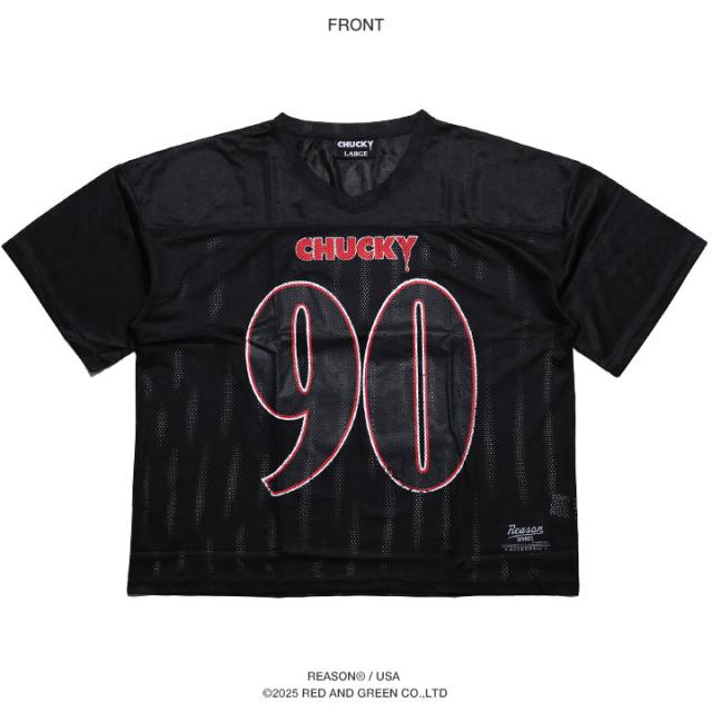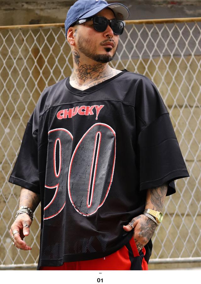 【40%OFF】REASON × Chucky Vネック 半袖 メッシュ Tシャツ 野球 ゲームシャツ メンズ 黒 大きいサイズ チャッキー Childs Play チャイルド・プレイ コラボ 公式 リーズン ビッグシルエット b系 ヒップホップ ファッション ストリート系 ハイ 服 2025夏 新作 CKY75