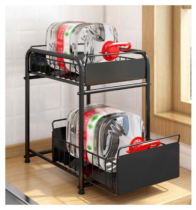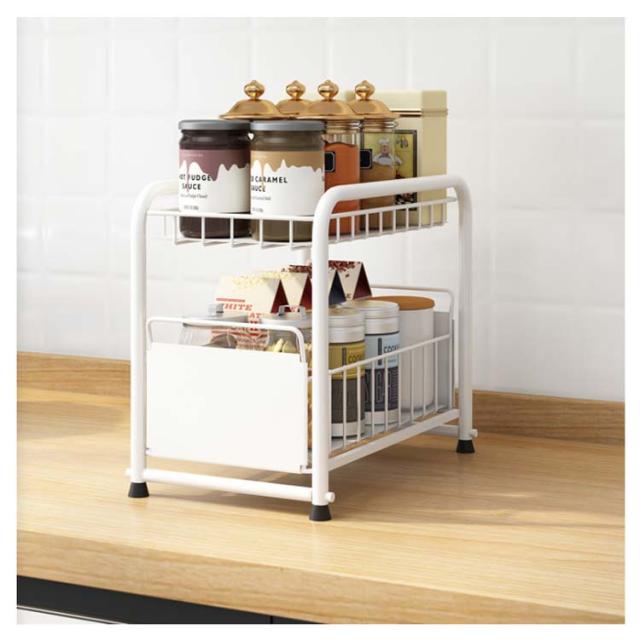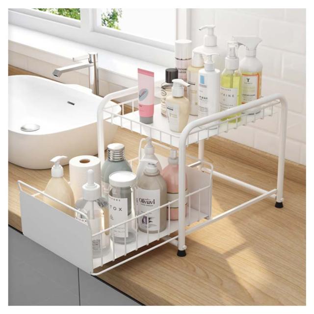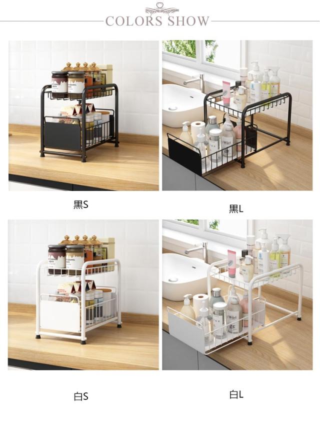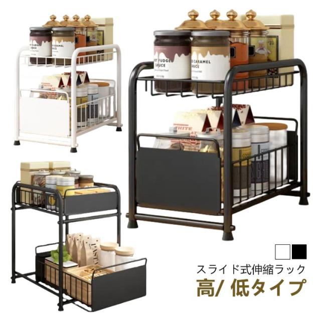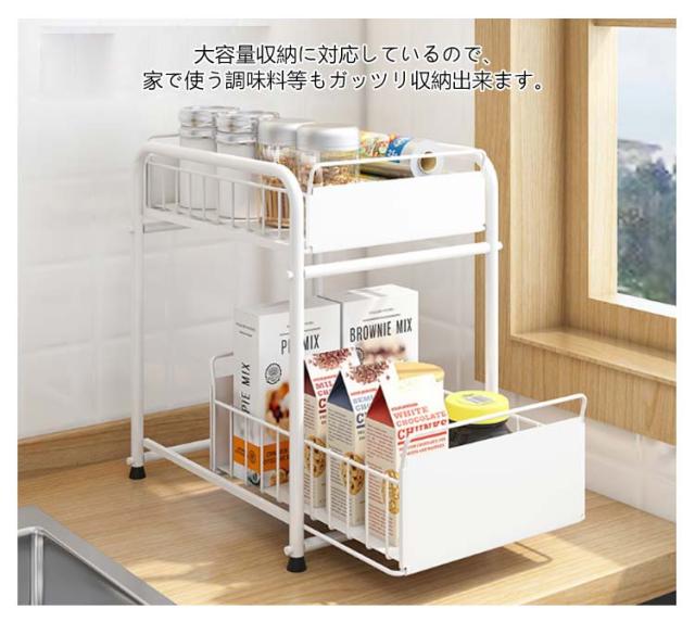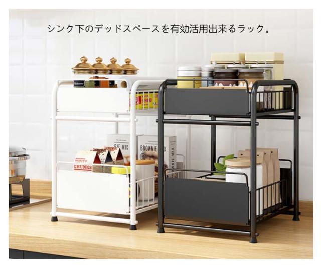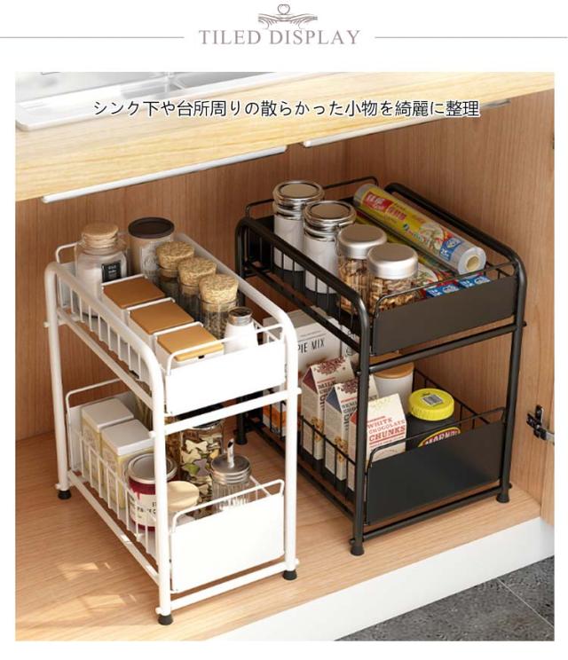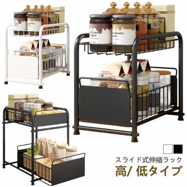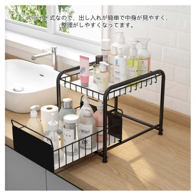 シンク下収納 キッチン下 伸縮 ラック スライド式 ラック 2段 収納棚 引き出し キッチン収納 スライドラック 台所収納 シンプル ブラック ホワイト シンク下スライドラック 多機能 調味料 収納 ボトルラック 洗面台下 収納 シンク下収納バスケット