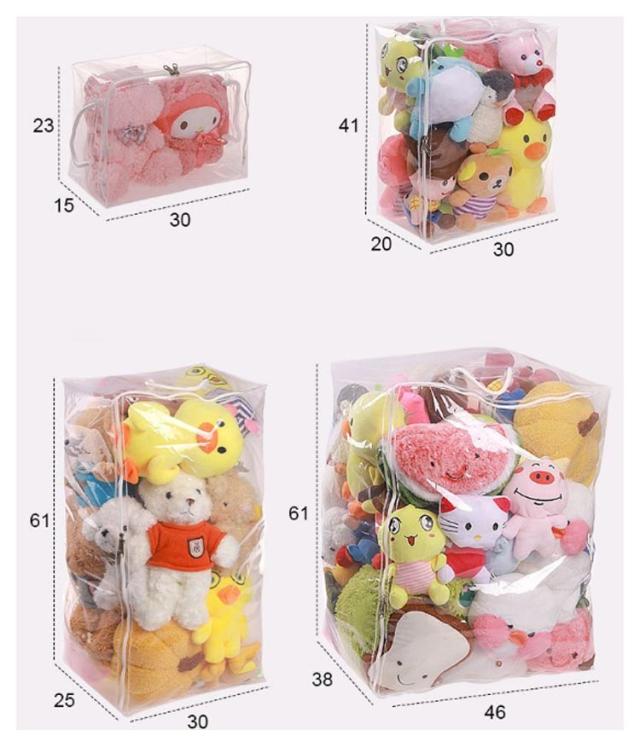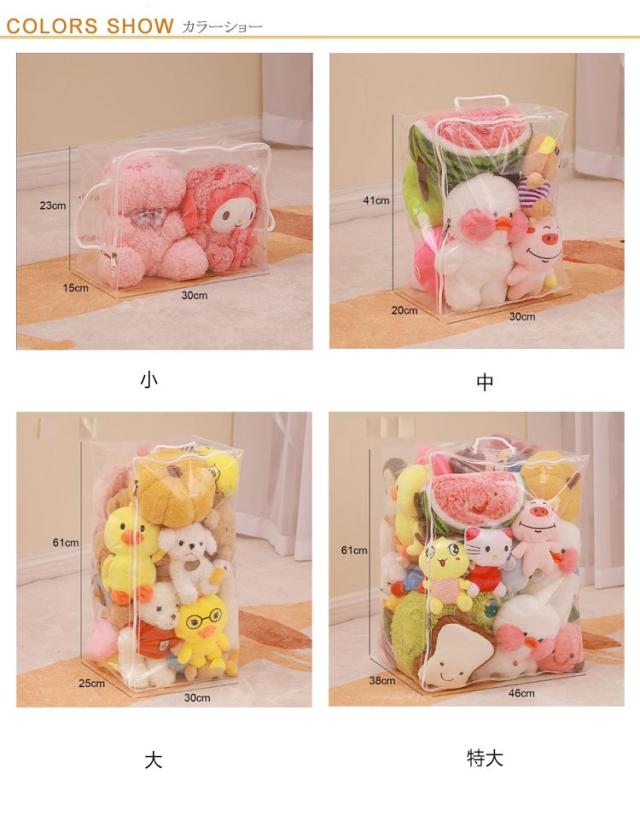 | 【ぬいぐるみ収納袋】【4サイズ】【取っ手付き】 おしゃれで機能的なぬいぐるみ収納袋。 透明の素材なので、おしゃれに収納でき、ファスナーを開けずに中身の確認が簡単にできます。 取っ手付きで、取り出しやすく、持ち運びしやすいです。 置き場所に困ったぬいぐるみの収納に最適です。 ぬいぐるみはもちろん、布団、衣類などのファッション小物を入れておくのにもオススメ。 | |