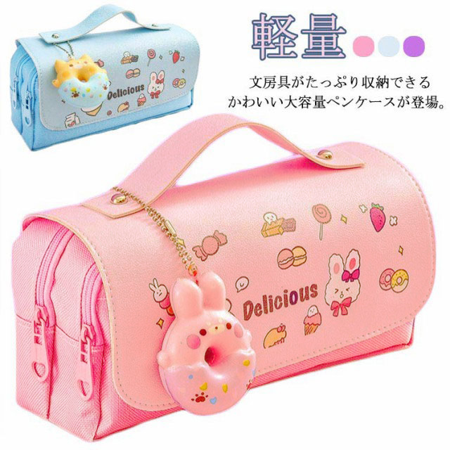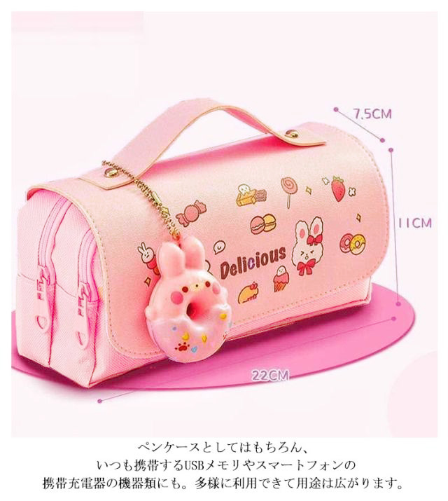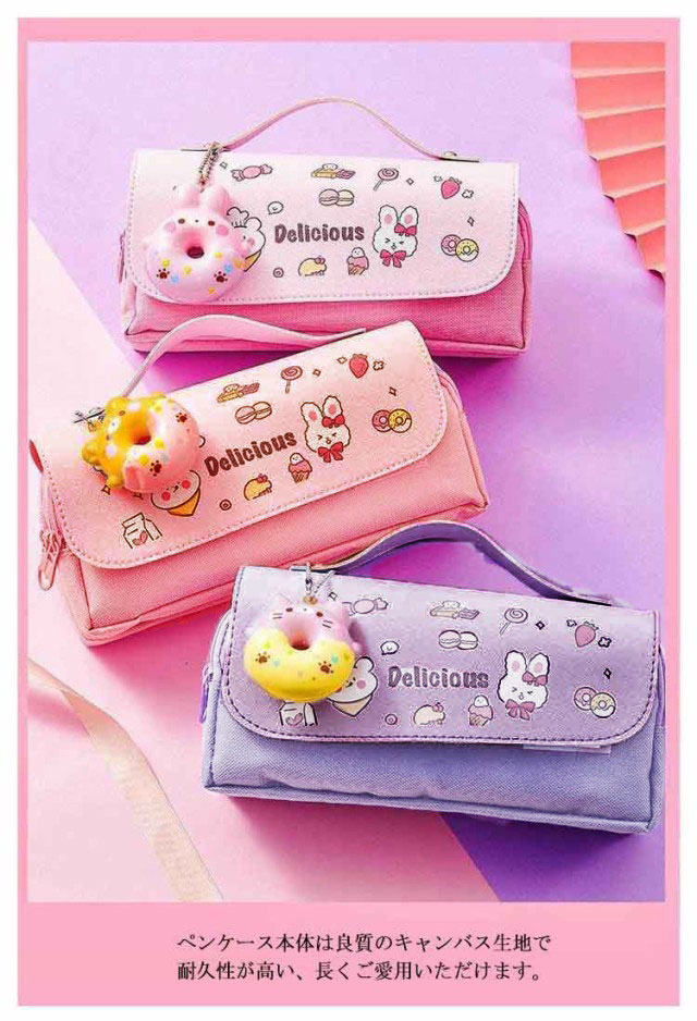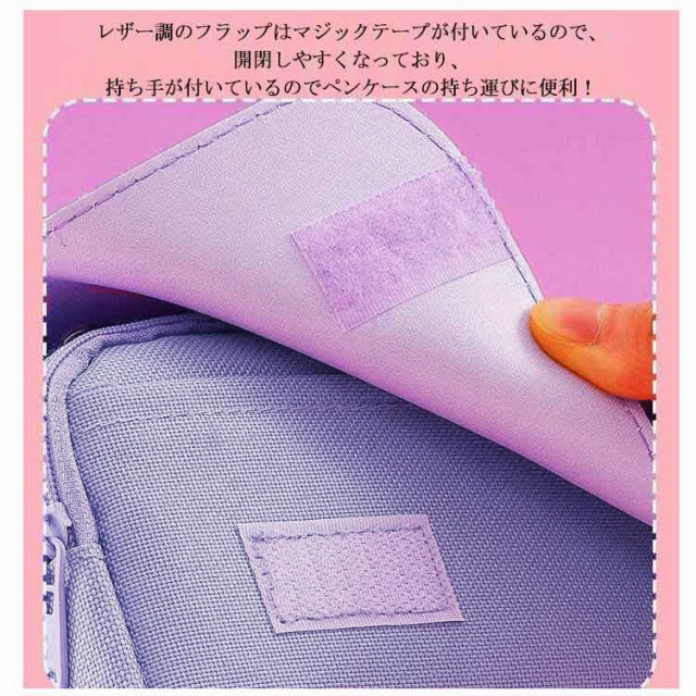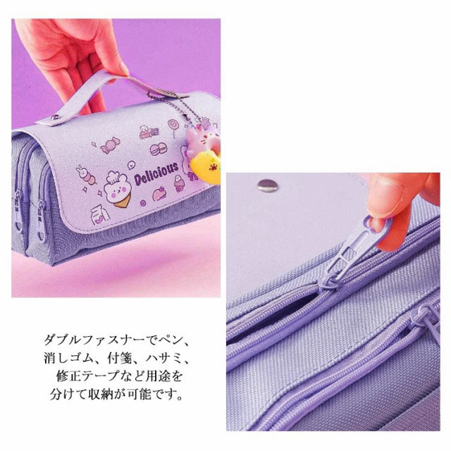 | 文房具がたっぷり収納できるかわいい大容量ペンケースが登場。 ぐるっと大きく開いて、いるものが見つけやすい。ダブルファスナーでペン、消しゴム、付箋、ハサミ、修正テープなど用途を分けて収納が可能です。 レザー調のフラップはマジックテープが付いているので、開閉しやすくなっており、持ち手が付いているのでペンケースの持ち運びに便利! ペンケース本体は良質のキャンバス生地で耐久性が高い、長くご愛用いただけます。 ストレス解消スクィーズを付き。可愛くてとっても便利なスグレモノ! ペンケースとしてはもちろん、いつも携帯するUSBメモリやスマートフォンの携帯充電器の機器類にも。多様に利用できて用途は広がります。 | |
