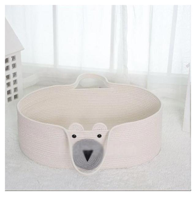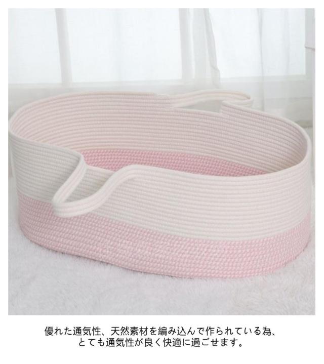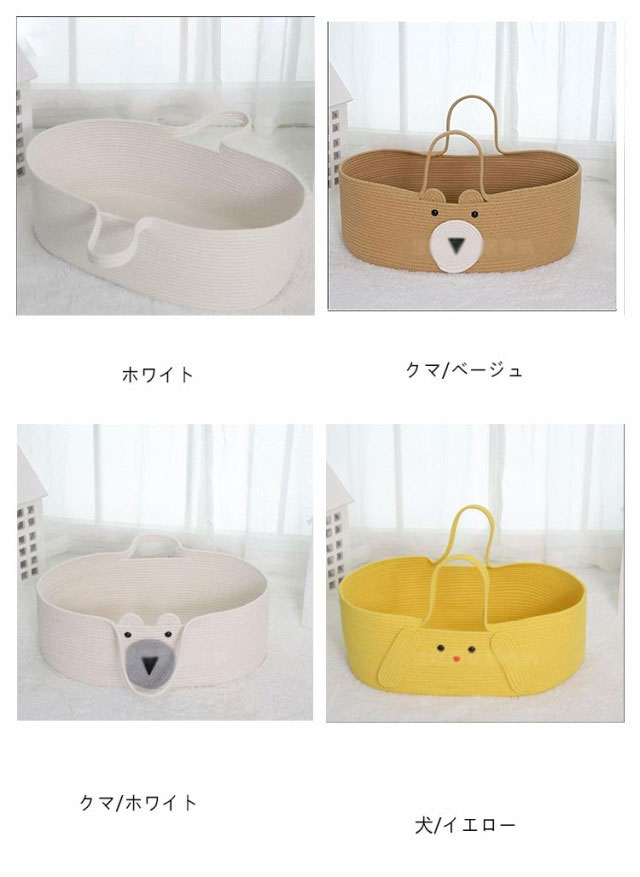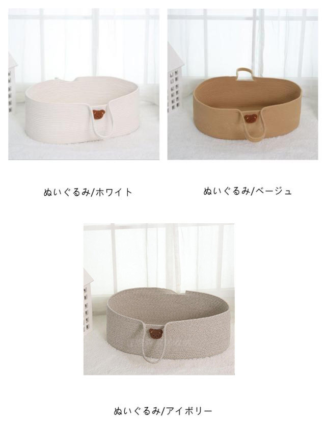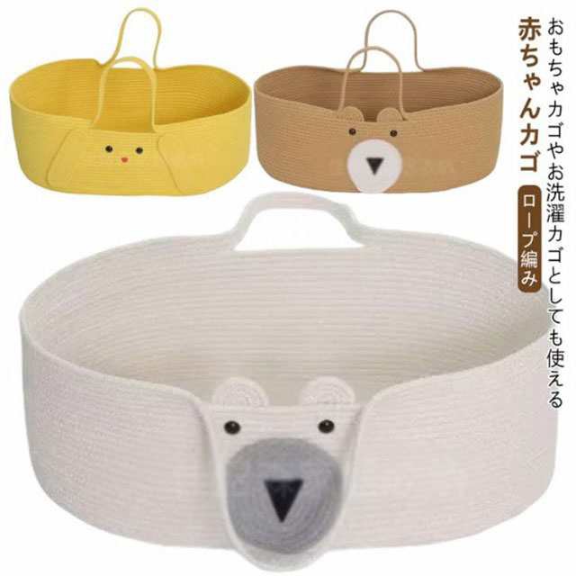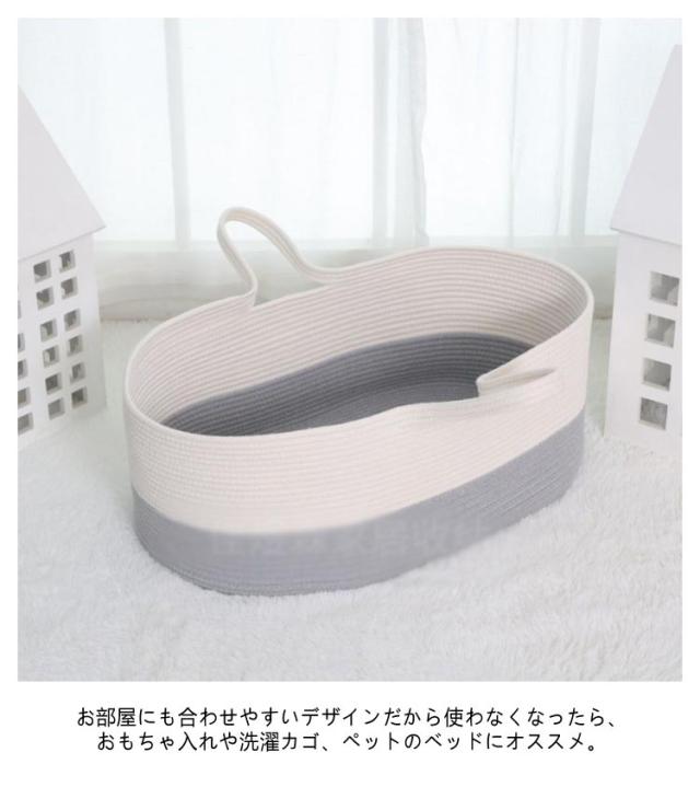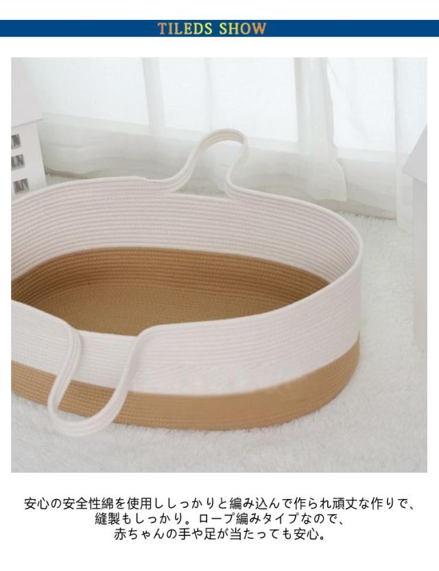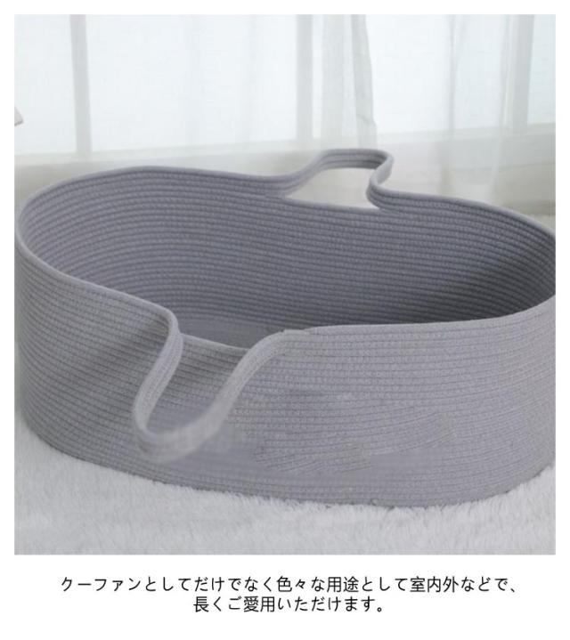 | おもちゃカゴやお洗濯カゴとしても使える赤ちゃんカゴ♪ 安心の安全性綿を使用ししっかりと編み込んで作られ頑丈な作りで、縫製もしっかり。ロープ編みタイプなので、赤ちゃんの手や足が当たっても安心。 優れた通気性、天然素材を編み込んで作られている為、とても通気性が良く快適に過ごせます。 クーファンとしてだけでなく色々な用途として室内外などで、長くご愛用いただけます。 お部屋にも合わせやすいデザインだから使わなくなったら、おもちゃ入れや洗濯カゴ、ペットのベッドにオススメ。 | |