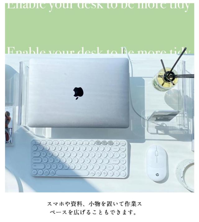 | デスク上がスッキリまとまるスタイリッシュなパソコンのモニター置台です。 キーボードを使用しないときには、ボードをラック下に収納できるので、机上にスペースが生まれ、机を広く有効活用することができます。 シンプルながらスタイリッシュ、背面の配線周りの邪魔をせず、デスク上が洗練された印象になります。 幅30cm/40cm/48cm、高さ80mm(内寸)と低め設計で、キーボードを収納することで、ホコリがたまるのも軽減します。 目線が上がり、姿勢が良くなったとのレビューも頂いています。長時間のデスクワークも快適。 スマホや資料、小物を置いて作業スペースを広げることもできます。 | |