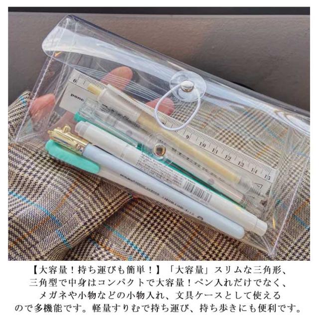 | (シンプルでお洒落!かわいい透明ペンケース・ペンポーチ!)大人気!学生の子ども、女の子、小学生、女子、中学生、高校生、大学生、社会人、大人のお仕事の時におすすめなおしゃれで安いぺんけーす、可愛い筆箱、ペン入れ、ぺんぽーち、筆入れ、文房具収納です。 (大容量!持ち運びも簡単!)「大容量」スリムな三角形、三角型で中身はコンパクトで大容量!ペン入れだけでなく、メガネや小物などの小物入れ、文具ケースとして使えるので多機能です。軽量すりむで持ち運び、持ち歩きにも便利です。 (収納しやすい!)しんぷるでオシャレなデザイン構造のぺんけーすなので、男の子や女の子、小学生の子供も文房具の収納に使えます。旅行に行く際のトラベルポーチ、メイク収納、化粧ポーチ、ツールケースとしてもおすすめです! (透明なので探しやすい)透ける筆箱なのでどこに何が入っているのか探しやすいです。また、ペンケースは机の上に置きやすいです。開けたら口が大きくなるところも、このふでばこの使いやすいところです。メガネ収納にも使えます。 (プレゼント・ギフト対応)こどもの入学祝い、大切な友達などにプレゼント・ギフト対応も承ります。 | |