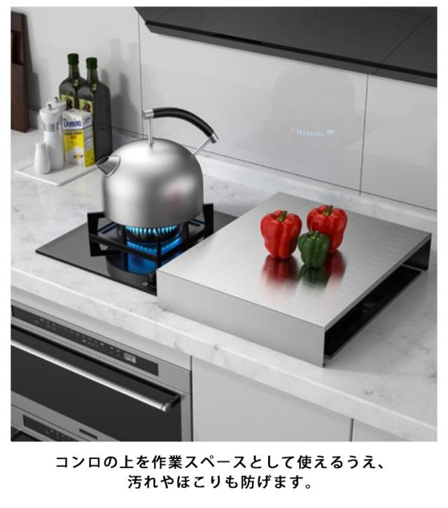 | ガスコンロの上が収納・作業スペースに早変わり! 調理中のちょい置きはもちろん、配膳台としても活躍します。 IHコンロやホットクック、電気圧力鍋などの置き場所としても使えます。 光沢のあるステンレス製カバーで、生活感が出がちなコンロ周りをすっぽり隠してスタイリッシュなスペースに。 ステンレス製なのでサビに強く、汚れたときはサッと拭くだけで清潔に保てます。 コンロの上を作業スペースとして使えるうえ、汚れやほこりも防げます。 | |