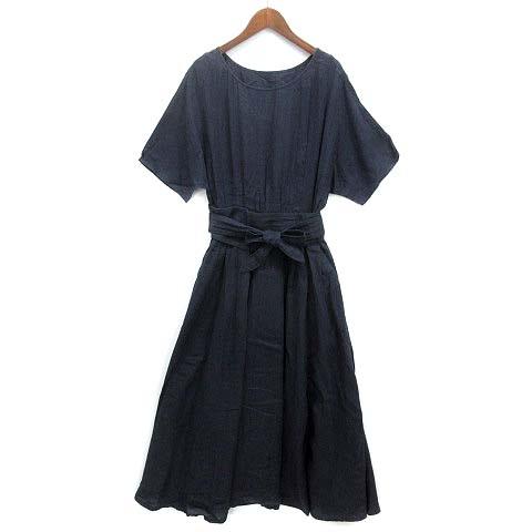 【中古】パリゴ PARIGOT リネン ロング ワンピース 半袖 ウエストリボン ネイビー 紺 F 日本製 レディース