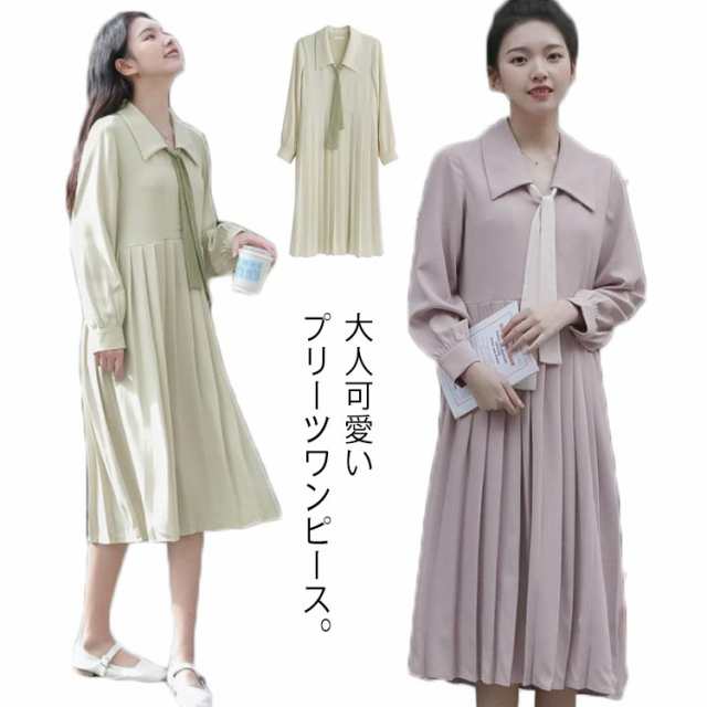リボン 夏 プリーツ プリーツワンピース 春 長袖 春 ワンピース 秋 ロング レディース ロングワンピース マキシ 裏地付き おしゃれ 通学 マキシワンピース