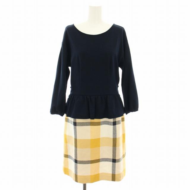【中古】ブルーレーベルクレストブリッジ ワンピース ひざ丈 長袖 チェック柄 38 紺 黄 55J03-606-60 レディース