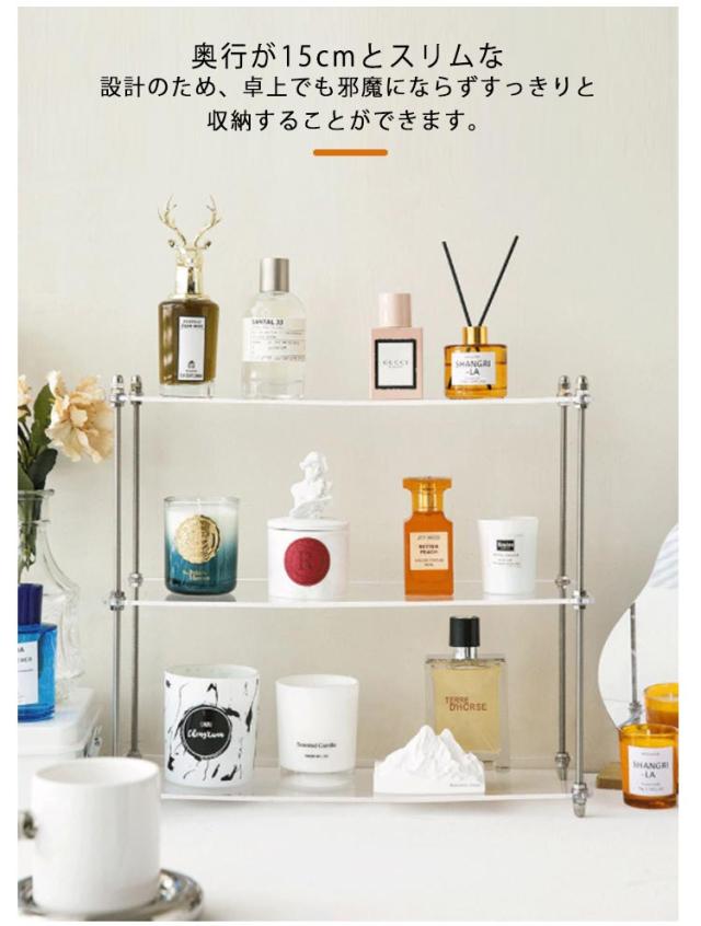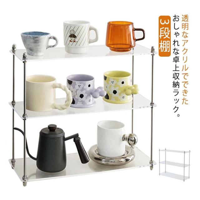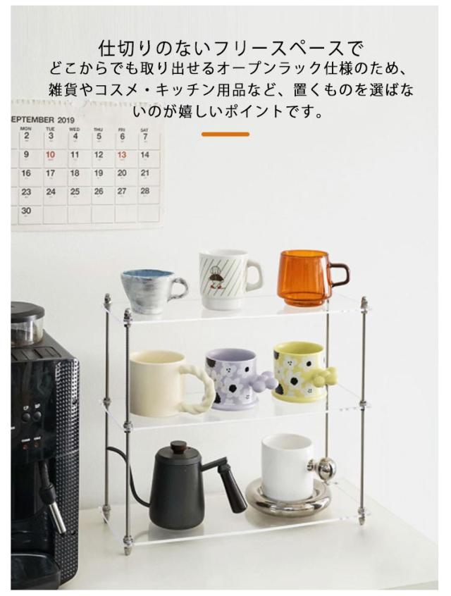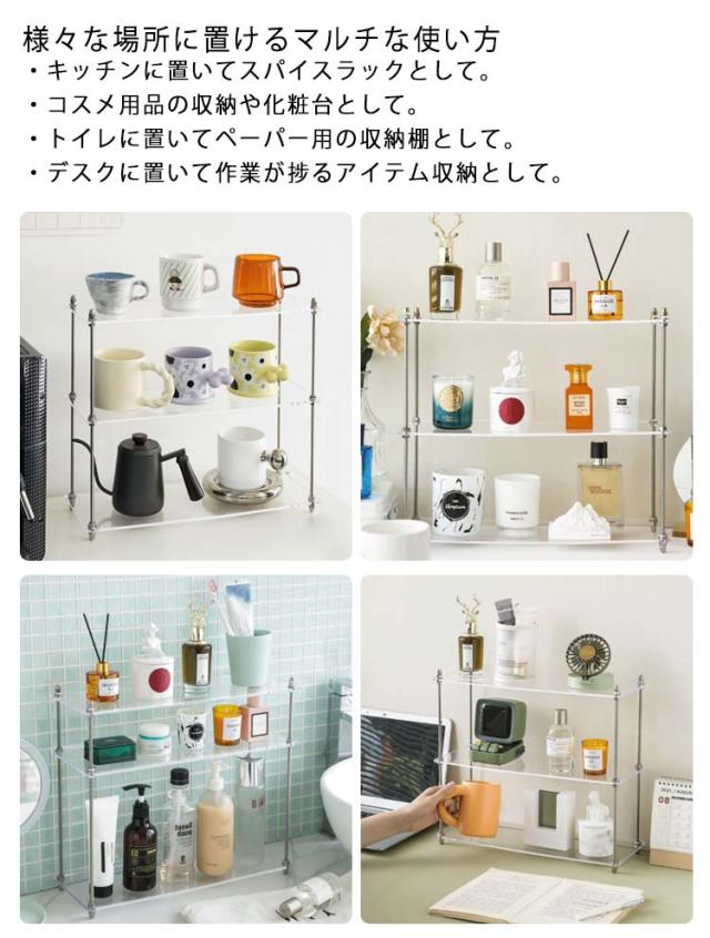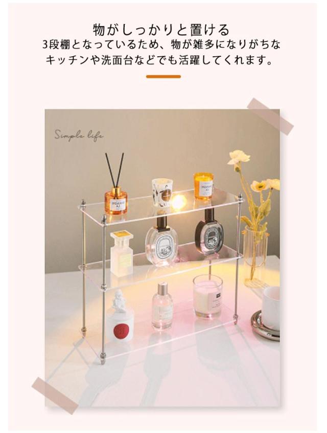 | 透明なアクリルでできたおしゃれな卓上収納ラック。 3段棚 物がしっかりと置ける3段棚となっているため、物が雑多になりがちなキッチンや洗面台などでも活躍してくれます。 奥行が15cmとスリムな設計のため、卓上でも邪魔にならずすっきりと収納することができます。 仕切りのないフリースペースでどこからでも取り出せるオープンラック仕様のため、雑貨やコスメ・キッチン用品など、置くものを選ばないのが嬉しいポイントです。 前からも、横からも、どの角度からでも物が取り出しやすく、どこに何が入っているかが分かりやすいです。 高い透明度とシンプルなデザインで圧迫感が無く、デスク上が洗練された印象になります。 様々な場所に置けるマルチな使い方 ・キッチンに置いてスパイスラックとして。 ・コスメ用品の収納や化粧台として。 ・トイレに置いてペーパー用の収納棚として。 ・デスクに置いて作業が捗るアイテム収納として。 | |