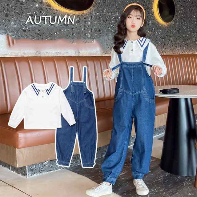 セットアップ 二点セット ホワイトシャツ+サロペット 襟付き 春秋 長袖 ブルー デニムズボン きれいめ 子供服 おしゃれ キッズ カジュアル 結婚式 女の子 洋装 お出かけ 110-170 可愛い