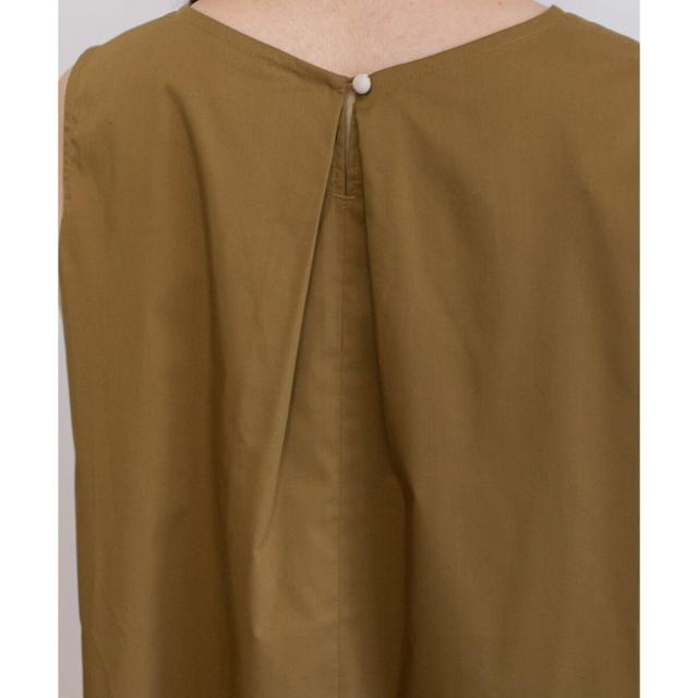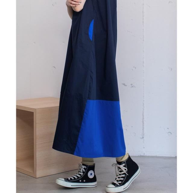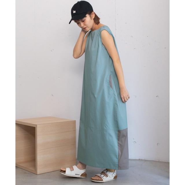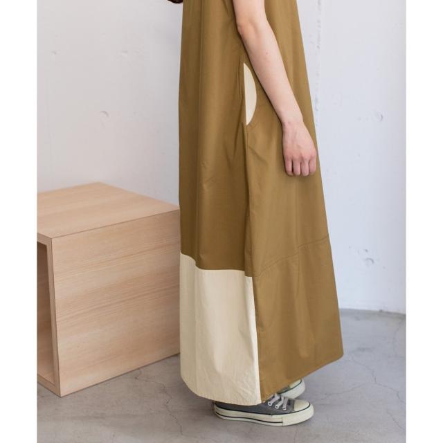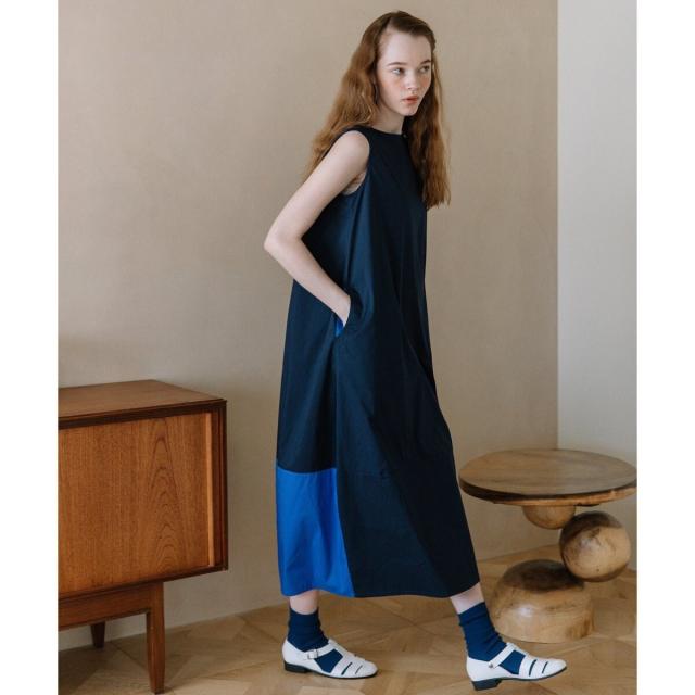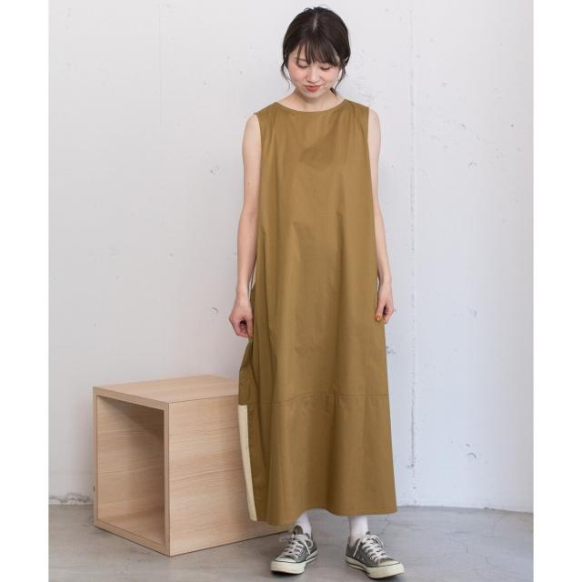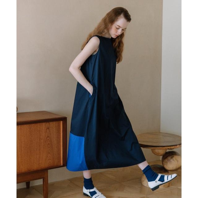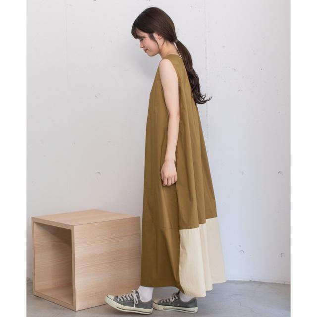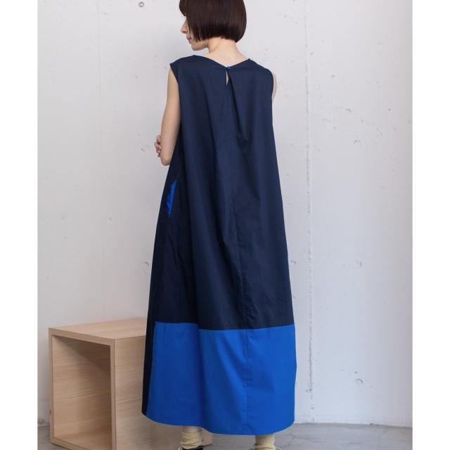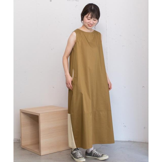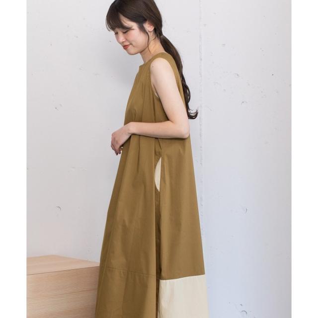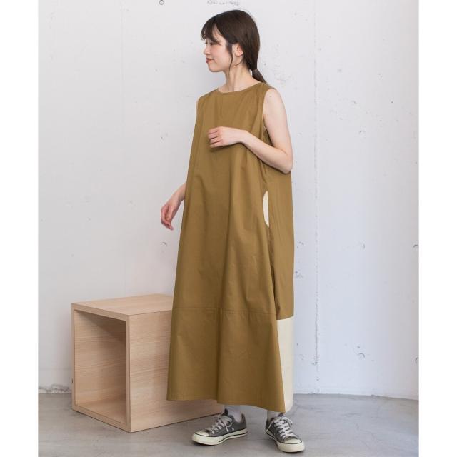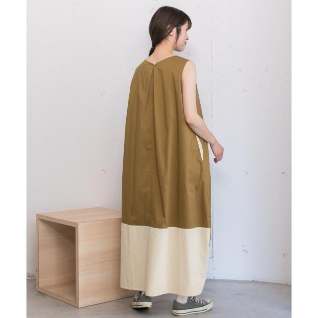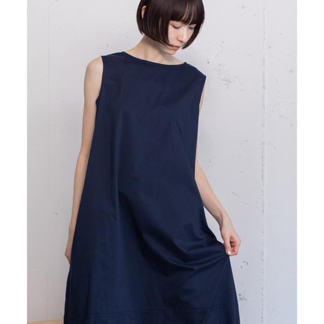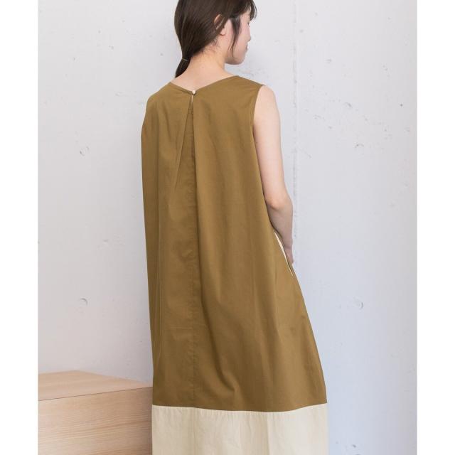 脇に丸みを出したコクーンシルエットと、バックヘムの配色切り替えが印象的なワンピース。ポケット口を丸くカッティングして配色がちらりと見えるようにしています。薄着になる季節に一枚で着映えして、暑い夏に重宝する袖なしのワンピース。シャツやカーディガンも羽織りやすいです。両サイドポケット付き。
