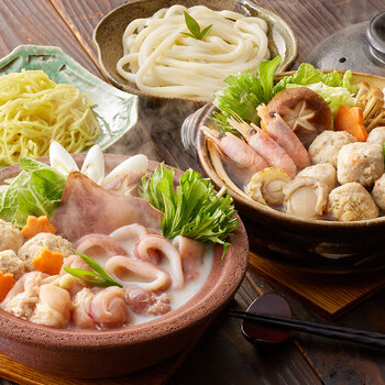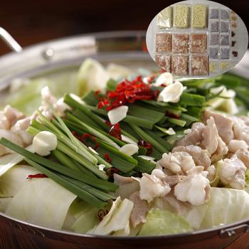プリプリの牛小腸に鶏の中でも少量しかとれないハラミを加え、醤油味のスープで楽しむもつ鍋とセットでお届けします。