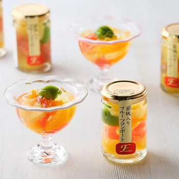 翡翠色の若桃(種ができる前の桃)をはじめ、みかん・甘夏・グレープフルーツ・パイナップルを、ふるふる食感のジュレで包みました。