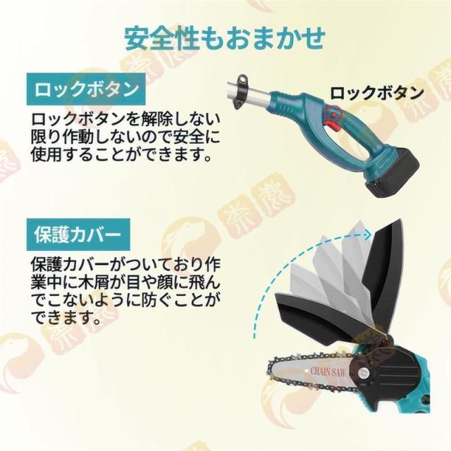 使用者の安全を確保ため3つの安全ポイント。ダブルロック:不意の誤操作を防ぐために、作業時にはトリガースイッチとロックオフボダンを同時に押すべき。人間工学に基づく設計:設計が不具合なツールを長期間使用すると、多くの怪我や障害を引き起こす可能性があります。柔らかいゴム製のハンドルは、長時間の作業でも快適な体験を提供します。また、チェーン締付けリングが締まった状態になるようにカバーナットを締めてご使用ください。使用中にチェーンが脱落する恐れがありますのでご注意ください。