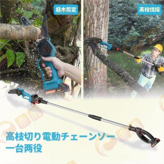 高枝切り電動チェーンソーは、6インチチェーンーを伸縮延長ポールと組み合わせたものです。
