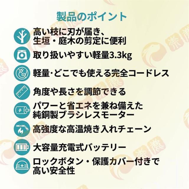 充電式電動チェーンソーはブラシレスモーターを採用し、ブラシ付き純銅モーターを使用した電動チェーンソーと比較して、寿命が300%増加し、出力電力が75%増加し、エネルギー消費量が50%削減されます. 硬い素材と強力なブラシレスモーターを備えた高枝切電動チェーンソーを選択して、目詰まりのない、低騒音、高効率の切断作業をお楽しみください。