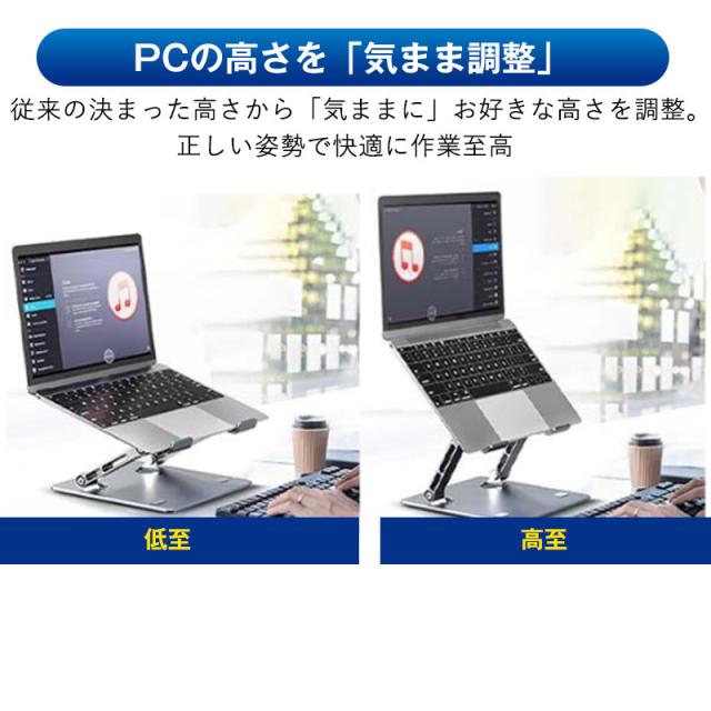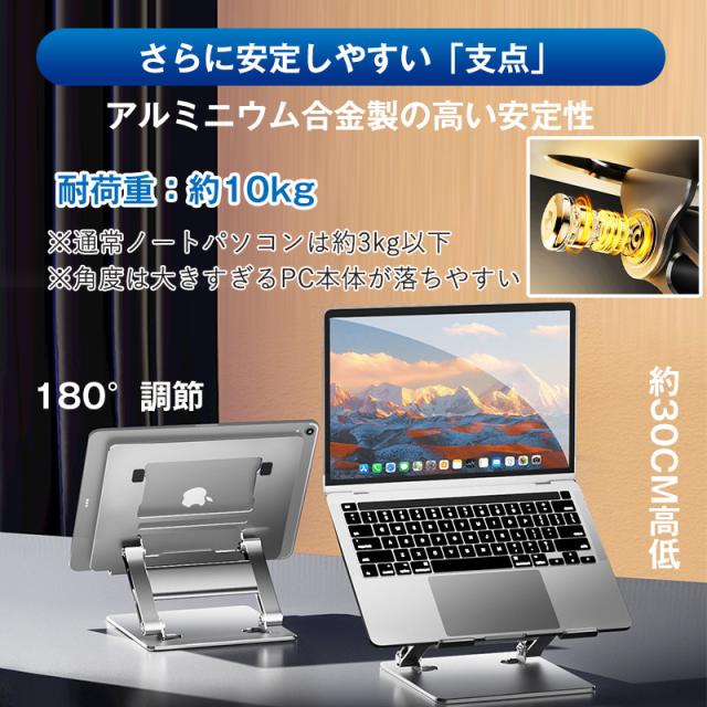 ノートPCスタンド パソコンスタンド ノートパソコンスタンド iPadスタンド 360度回転式 台 膝上 モニター 机上 折りたたみ 折りたたみ式 縦置き アーム クーラー ラップトップ 10段階調整 改良版 アルミ 合金製 ホルダー 高さ 角度調整可能 滑り止め 軽量 姿勢改善 持ち運び アルミ合金素材 机上 シルバー