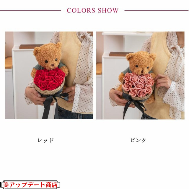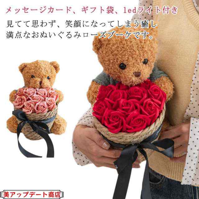 | 見てて思わず、笑顔になってしまう癒し満点なおぬいぐるみローズブーケです。【メッセージカード、ギフト袋、ledライト付き】 石?で作られているお花です。 石けんのいい匂いがふんわりと香るので人気があります。大切な人へのプレゼントへぴったり! 生花のように水やりやお手入れの必要がなく、枯れる心配も虫や花粉の心配もありません。 ふわふわの愛らしいベアがどんな素敵なシーンも可愛く華やかに彩ります 大事な記念日にプレゼントとしてそのままお渡しすることも可能です。玄関やお部屋にそのまま飾って頂くだけで、ほのかな香りが楽しめるインテリアや飾りになるおしゃれな芳香剤として女性にも男性にも喜ばれるフラワーギフトです。 母の日、バレンタイン、入学式、卒業式、退職祝い、結婚式、誕生日、記念日など、ちょっとしたプレゼントにぴったりです。 【手提げ袋付き】おしゃれな手提げ袋付きです。袋に入れると送った相手も持ち運びに便利です。 | |
