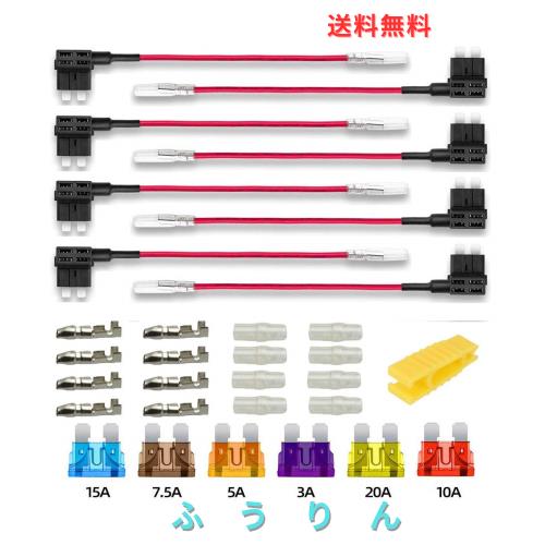 ?セット:8個平型ヒューズ電源取り出し配線+6個中型ューズ(3A/5A/7.5A/10A/15A/20A)+1個ヒューズ抜きクリップ+8個配線コネクタ+8個プラスチックキャップ。